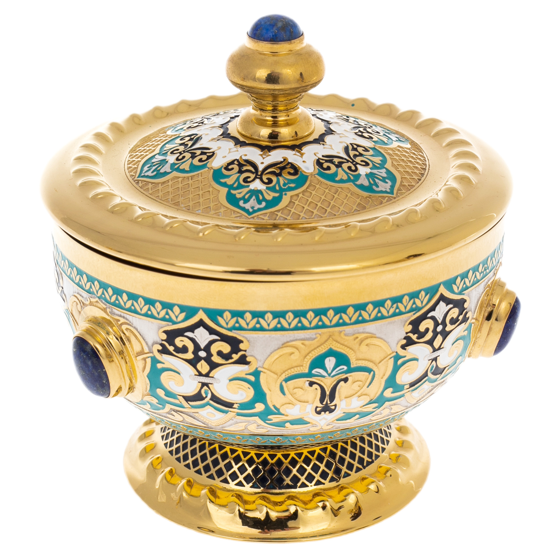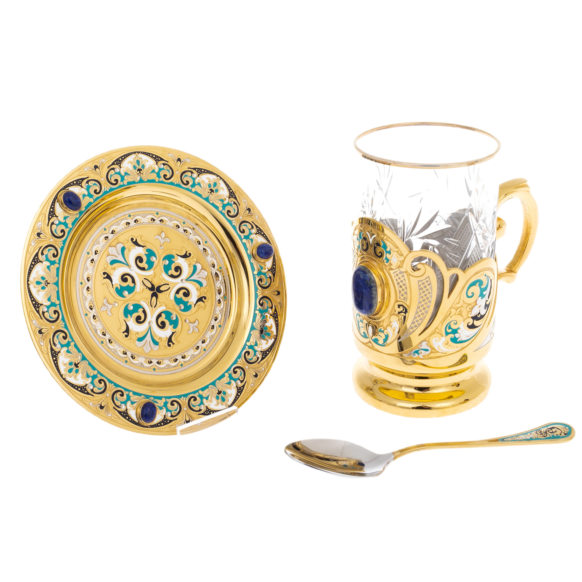 Подстаканники с изумительными вставками из лазурита— как символ вечной природы, заключённой в рамки человеческого творчества. Они придают сервизу торжественный облик и подчёркивают его эксклюзивность. Тонкость гранёного стекла стаканов позволяет напитку сиять, превращая даже самый обычный чай в настоящее царское угощение.