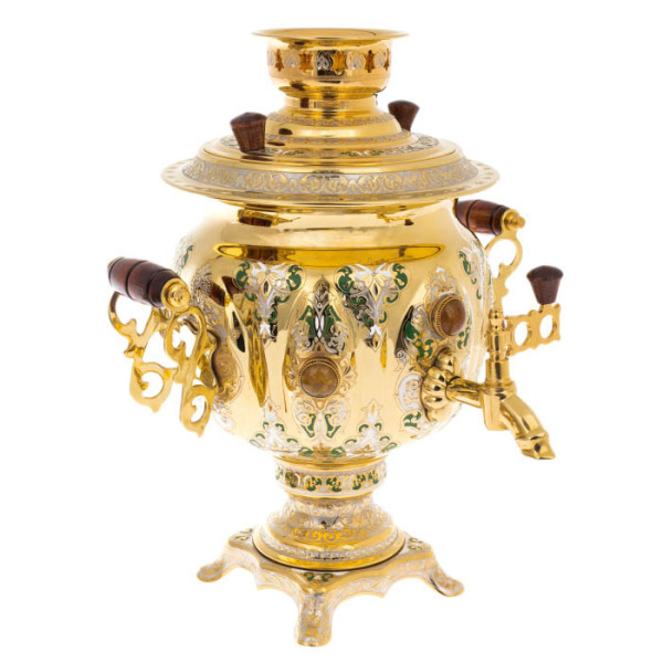 The samovar, decorated with intricate carvings and green enamels, seems to come to life under the flickering light, its shapes resemble a precious relic that holds the secrets of the ages. Handles made of noble wood, framed with gold elements, add not only aesthetic value to the product, but also warmth, which is felt in every touch. The delicate and elegant tap of the samovar, from which drops of tea infusion, as if with golden dew, merge into bowls, completes the image.