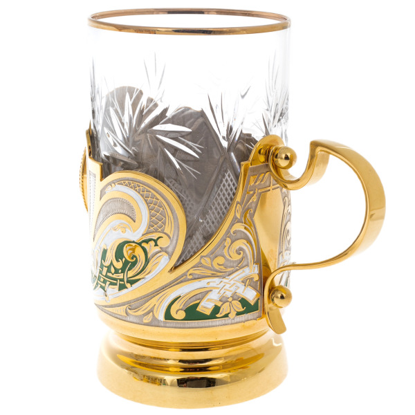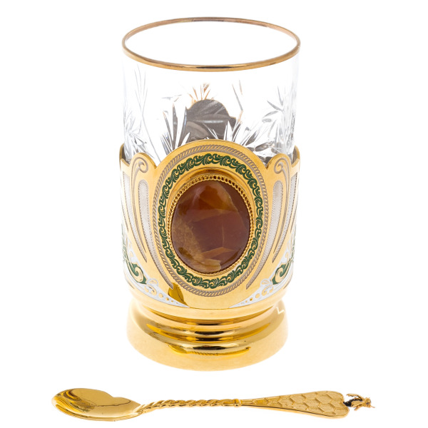 The four cup holders, each decorated with natural stone, seem like small masterpieces designed for royal hands. The crystal glasses, chiseled to perfection, sparkle in the light, emphasizing the grandeur and sophistication of the composition. They are engraved with exquisite patterns intertwined with gilded details that reflect the craftsmanship and passion invested in the creation of this set.