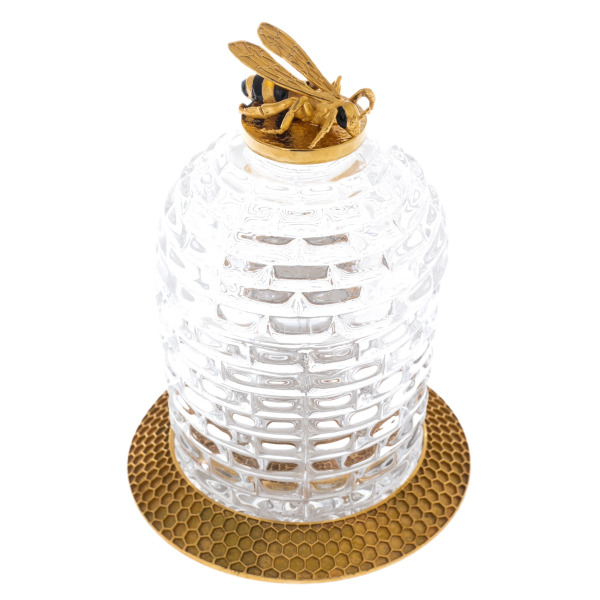 Swirls of patterns resembling honeycombs unfolded on the tray, sparkling with golden hues — a symbol of diligence and the sweetness of honey. This image is completed by a glass jar for honey with an elegant bee on the lid, a symbol of harmony between nature and art. It seems to contain precious nectar, ready to complement the taste palette of the royal tea party.