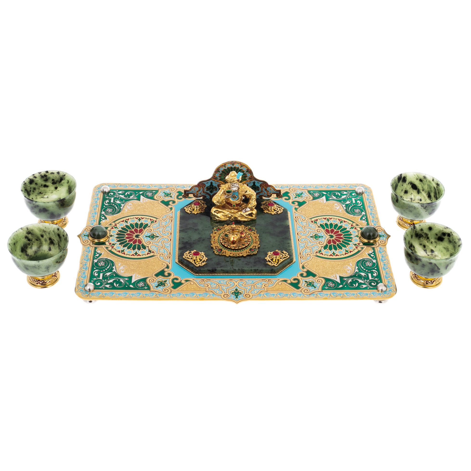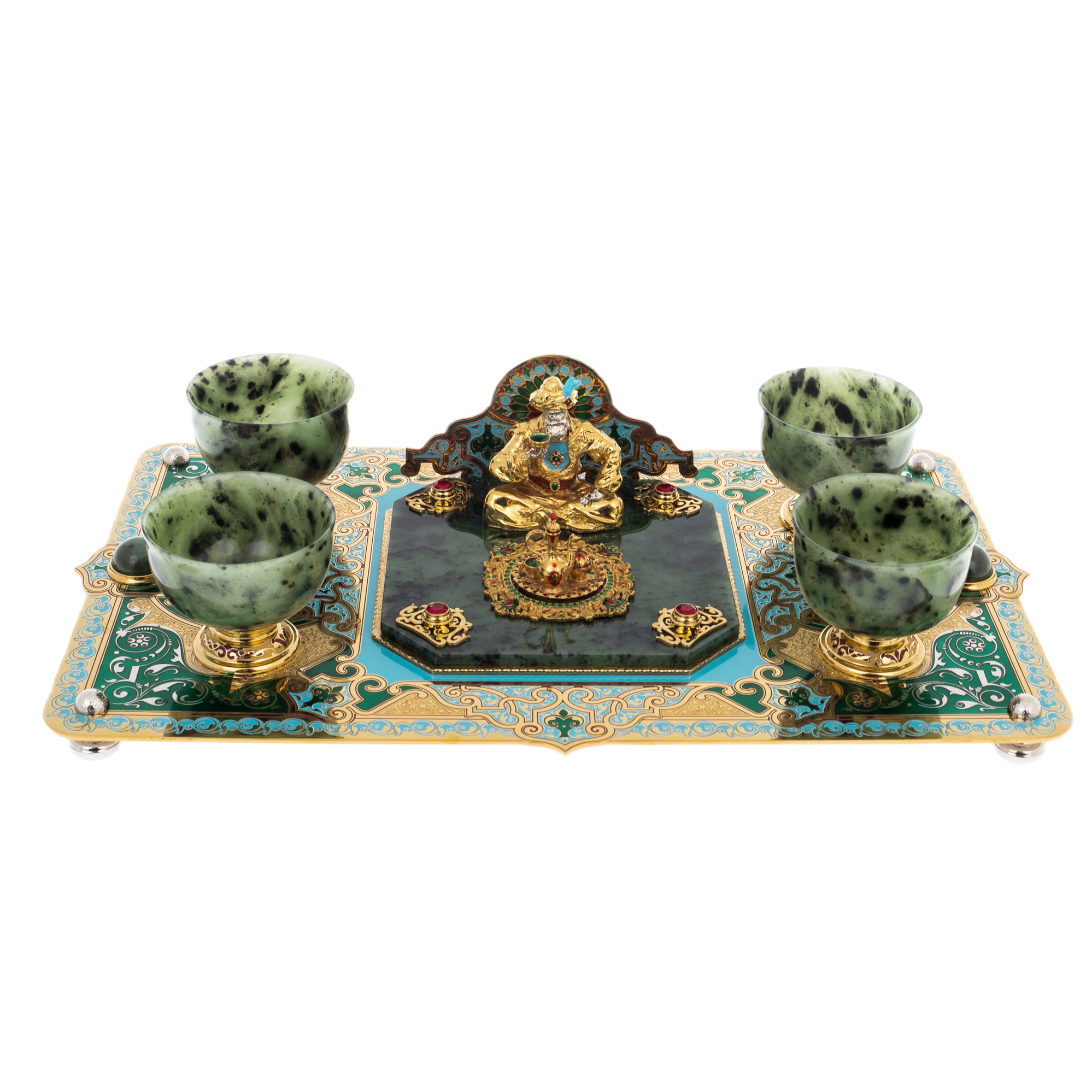 Чайный набор «Восточный» — воплощение художественного богатства Златоустовской школы и экзотической эстетики Востока, объединённых в утончённый композиционный ансамбль. Четыре чаши, выточенные из натурального нефрита с его причудливыми включениями, будто собраны из живого камня, бережно помещены на золочёные подставки с филигранной эмалью. Центр композиции венчает фигура знатного вельможи, восседающего с чашей в руке, окружённого миниатюрным кофейным сервизом — всё исполнено с ювелирной точностью и покрыто многослойной эмалью в оттенках сапфира, изумруда и рубина.