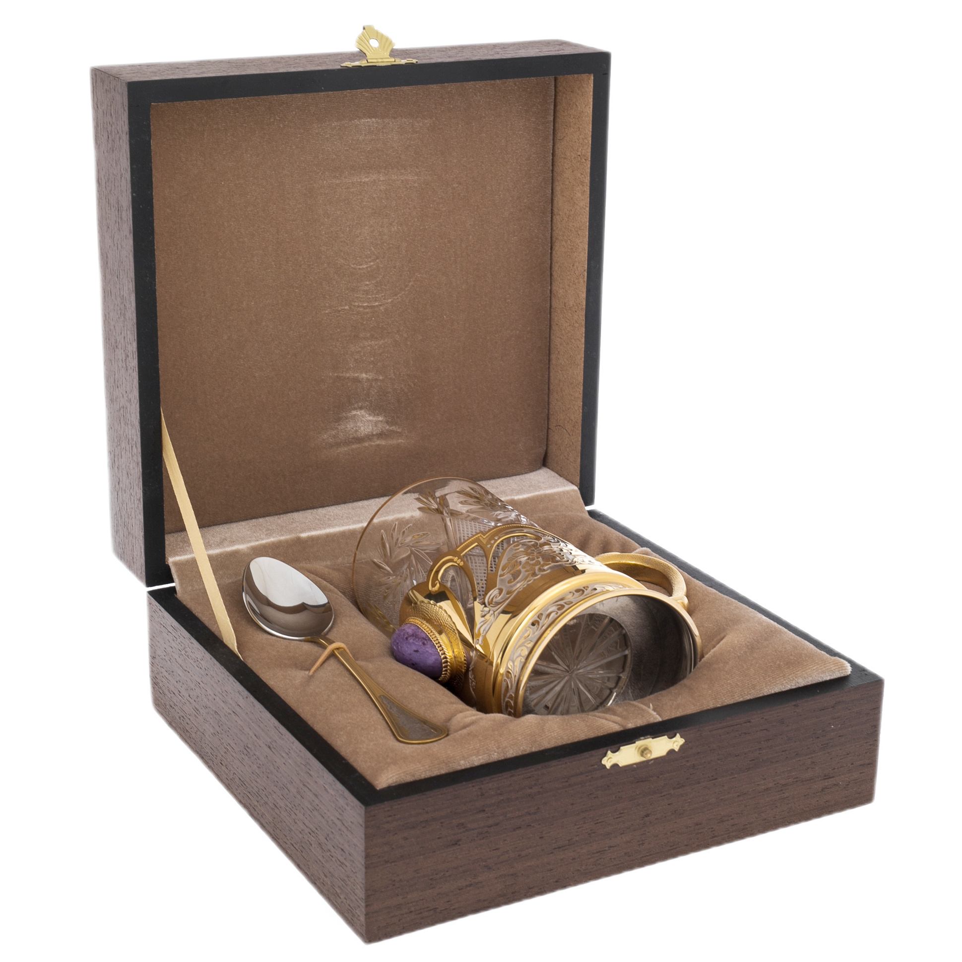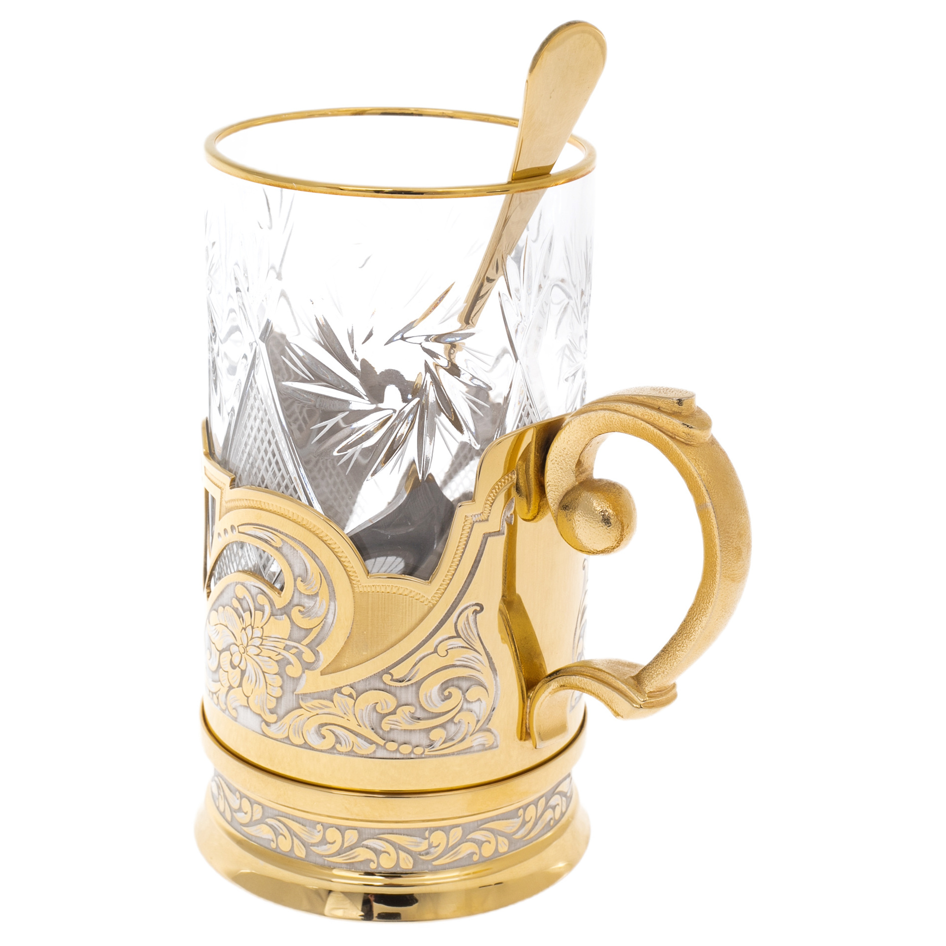 Чайный набор "Чары" с чароитом воплощает утонченную роскошь и вековые традиции златоустовского мастерства. Подстаканник из благородного металла, украшенный филигранной гравировкой, сверкает благородным блеском золочения, а изумрудные вставки из натурального малахита подчеркивают его статусность. Каждая деталь продумана до совершенства: от изящного завитка ручки до узоров, искусно выгравированных на металлической поверхности. Хрустальный стакан с тончайшей огранкой преломляет свет, превращая чайную церемонию в эстетический ритуал. Позолоченное блюдце, дополненное малахитовыми кабошонами, создает завершенный образ, отражая богатую традицию русской чайной культуры.