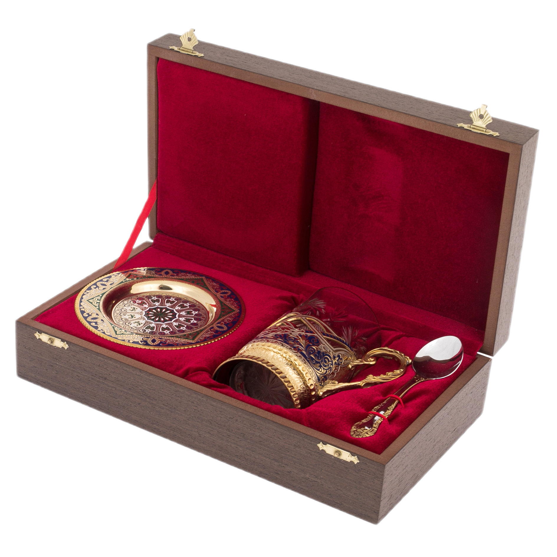 Package contents: cup holder, glass, teaspoon, wooden case.