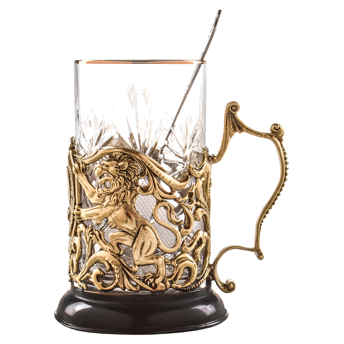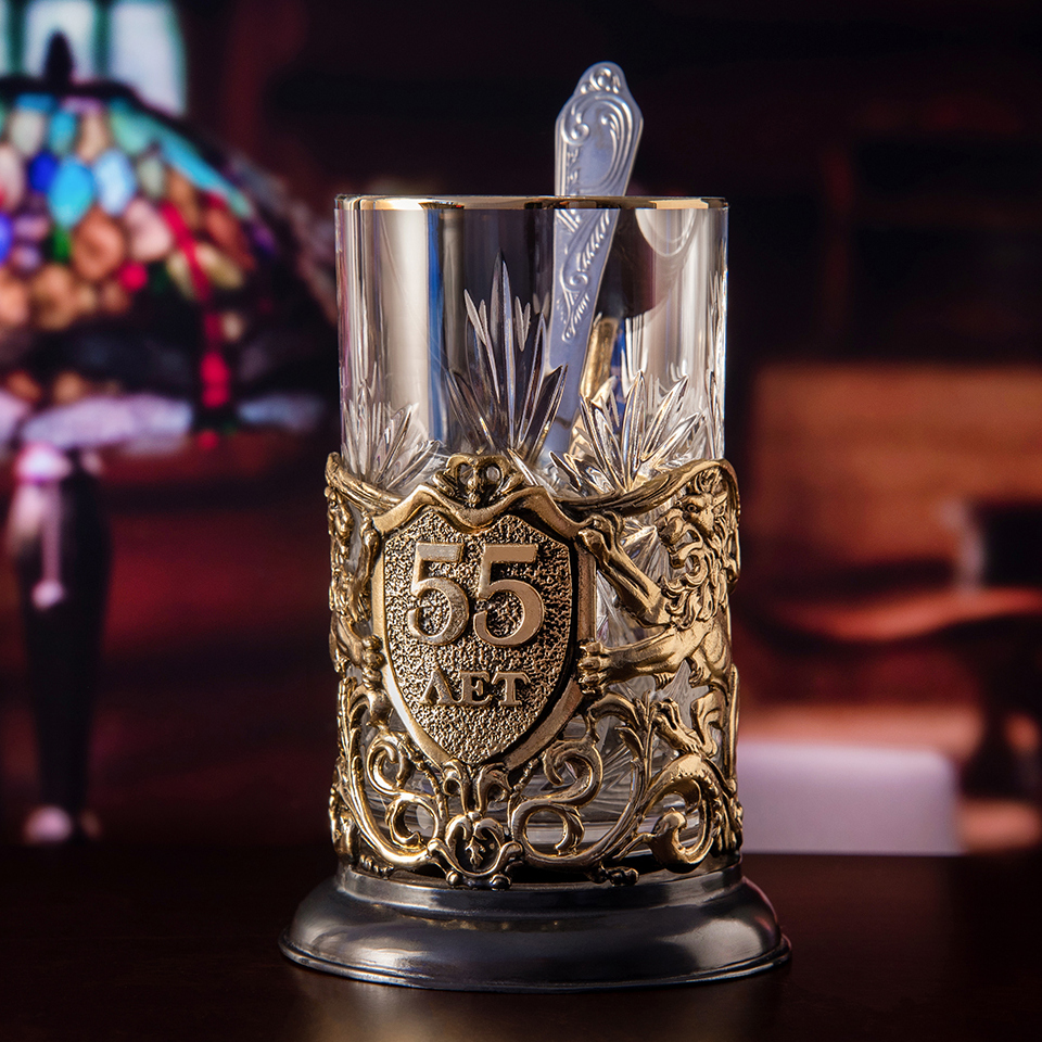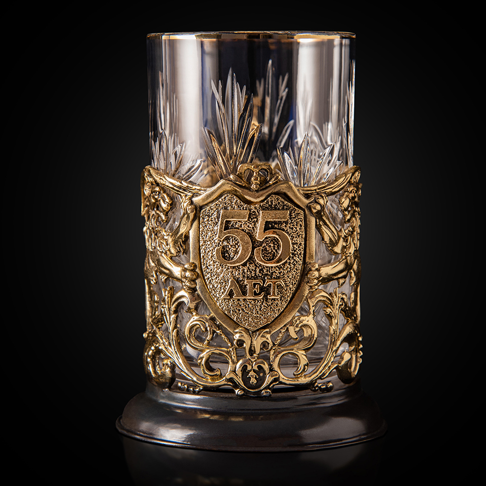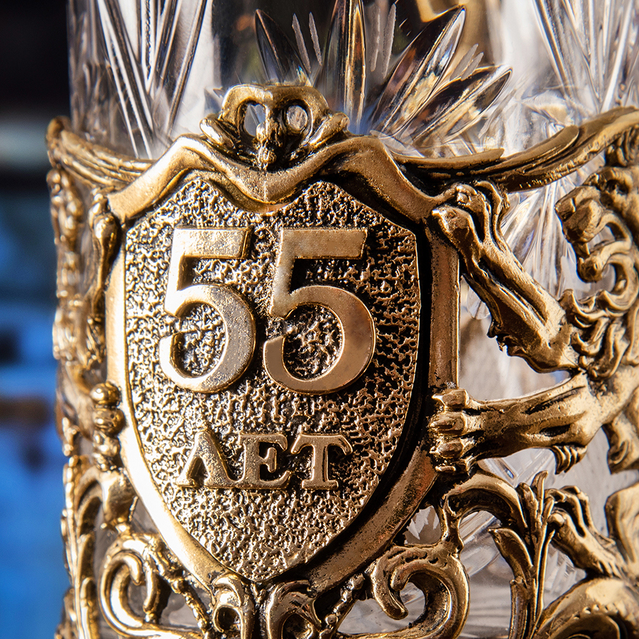 Подстаканник из латуни с юбилейной надписью «55 лет» — символичный знак внимания, выраженный в благородных материалах и утончённой пластике форм. Композиция собрана из хрусталя ручной огранки и латунного литого обрамления с патинированной поверхностью. Стекло блистает глубокими лучами граней, создающими игру света, а латунный корпус венчается центральным элементом — щитом с горельефной надписью, словно выведенной на старинной медали. Фигуры геральдических львов, расположенные по сторонам, подчёркивают торжественность момента и идею достоинства.