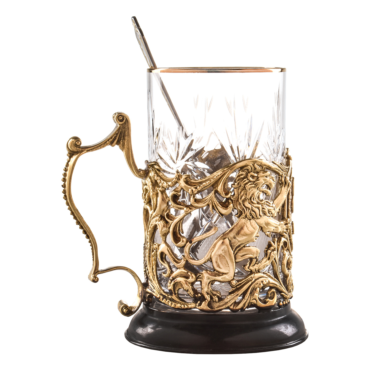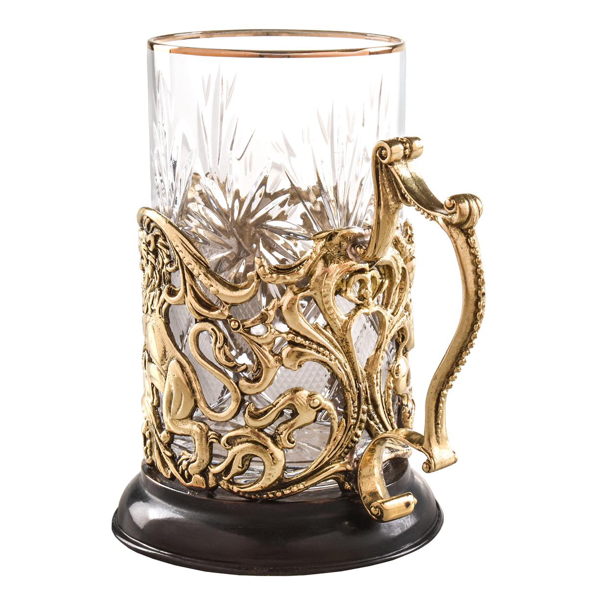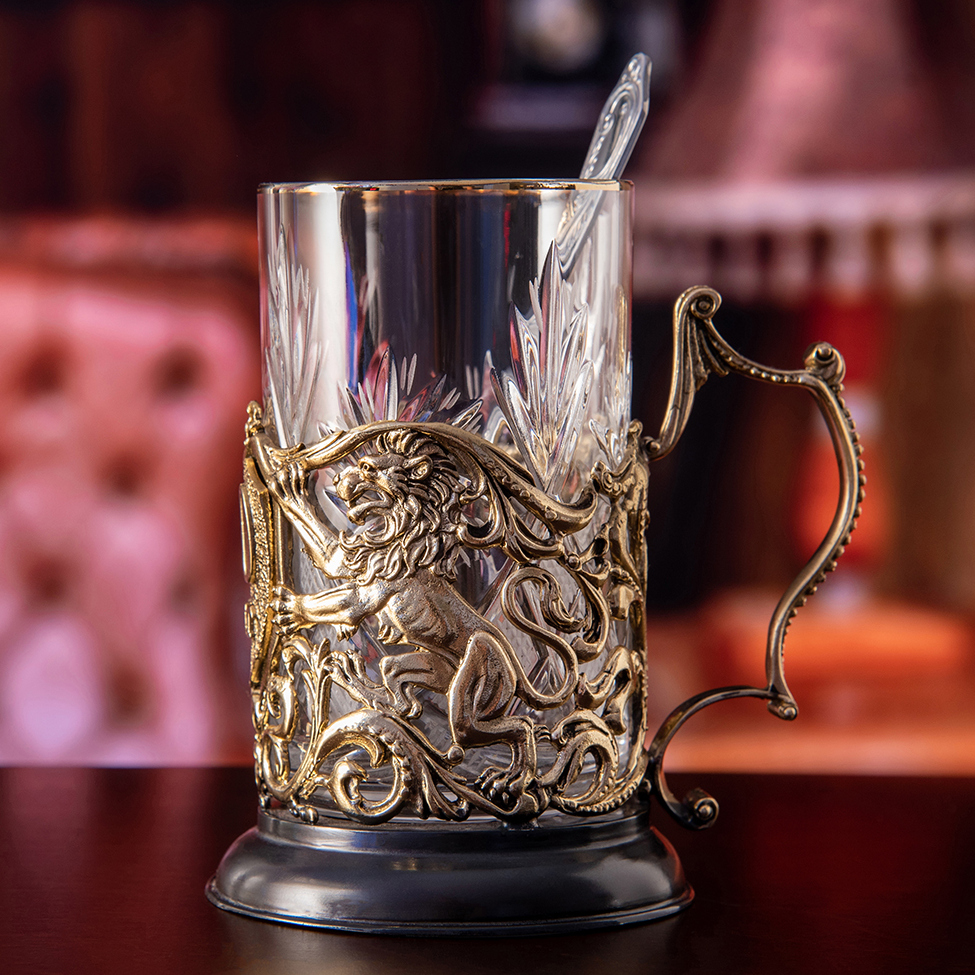 Ножка и ручка подстаканника вылиты с ювелирной точностью, где каждая линия и завиток несут не только декоративную, но и символическую нагрузку. В орнамент вписаны аллегории силы, изобилия и мудрости — черты, ассоциируемые с возрастом зрелости. Богатая фактура, глубина патинирования и плотность металла формируют ощущение монументальности, тогда как прозрачный хрусталь вносит в композицию свет и лёгкость. Контраст материалов и виртуозность исполнения создают завершённый образ подарка, достойного по-настоящему исключительного события.