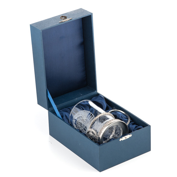 The glass is hand-engraved. Branded gift case included. The cup holder can be equipped with a spoon.