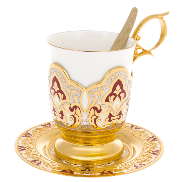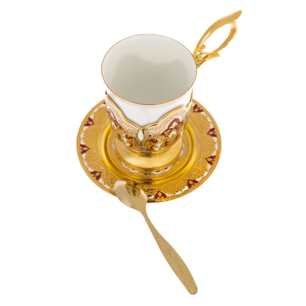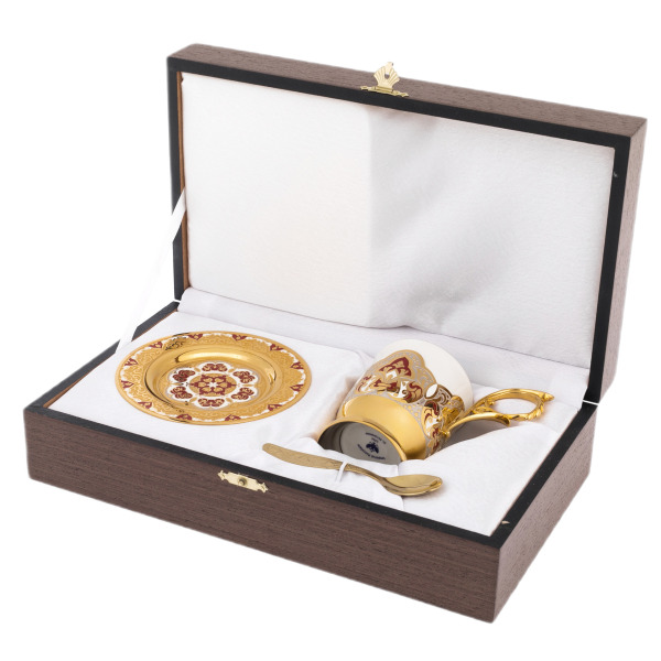 The golden spoon, harmoniously complementing the cup, is filled with the symbolism of luxury and sophistication. Her curves and exquisite finishes express power and status that are appropriate only in the hands of those who appreciate greatness in both art and life. Every touch of this set seems to introduce you to a sophisticated world in which harmony and grandeur become an integral part of everyday life.