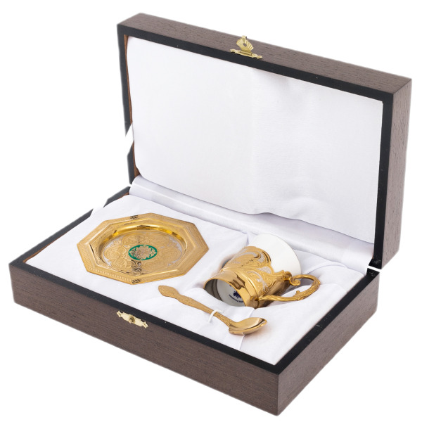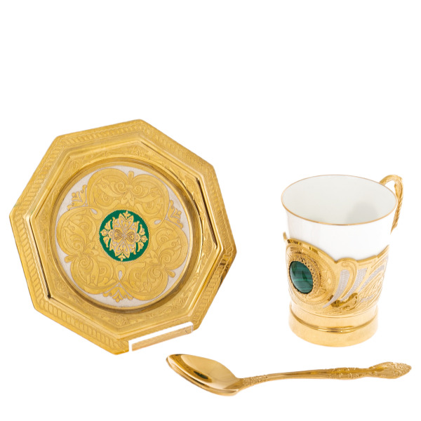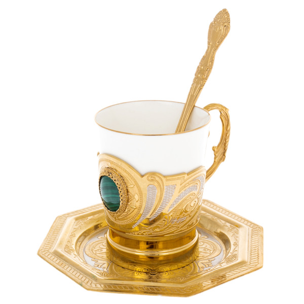 Кофейная пара в златоустовском исполнении являет собой утончённый предмет личного ритуала, созданный для ценителей момента, в котором встречаются красота, вкус и тишина. В её основе — изящная фарфоровая чашка, заключённая в позолоченную оправу с тончайшей гравировкой, выполненной вручную. Линии орнамента, ложащиеся на металл плавными волнами, образуют изысканный рисунок, подчёркнутый сиянием вставки из натурального малахита. Камень с глубокой зелёной структурой придаёт композиции характер и наполняет её ощущением природной силы и древнего благородства.