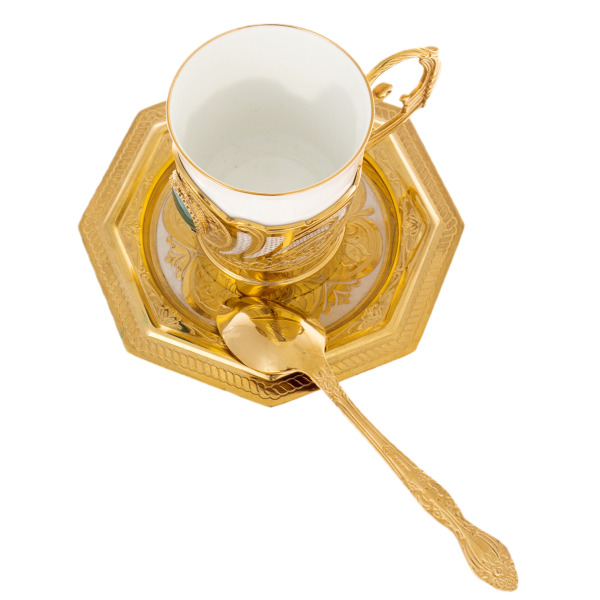 Позолоченное блюдце восьмигранной формы поддерживает мотивы чашки: гравированные завитки, тонкие серебристые акценты, зеркальная гладь металла, создающая игру света под разными углами. Каждая грань выглядит так, будто над ней работал ювелир, добиваясь безупречного ритма и симметрии. Завершающий штрих — миниатюрная ложка, украшенная рельефным узором, гармонично перекликающимся с оформлением пары.