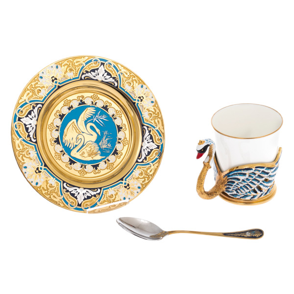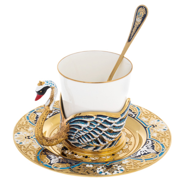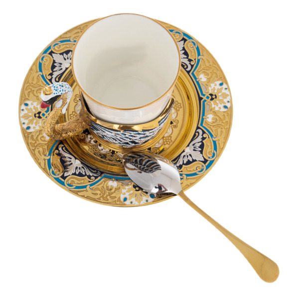 The coffee set "Swan's Fidelity" is a poem in porcelain and metal, created for sophisticated connoisseurs of beauty and symbolism. The set includes a cup, saucer and spoon made in the same artistic style. The cup is decorated with a swan figure — proud, noble, in love. Its curved neck forms an elegant handle, and each feather line on the wing is highlighted with enamel flecks and gilding. On the saucer, in the center of the golden circle, there is a pair of swans surrounded by floral ornaments, as if a moment of harmony and eternal affection is captured.
