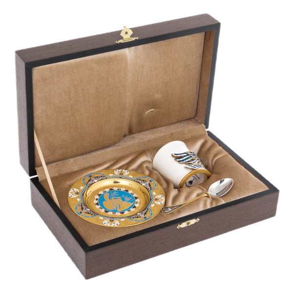 The design is based on the Zlatoust technique, an art that combines metal engraving, gilding and hot enamel. Each element is handmade with jewelry precision: smooth lines of feathers, contrasts of black, white and blue enamel colors, the finest floral patterns on the saucer. The ornament forms a complete decorative composition, in which there is not a single random detail — every line, every shade is thought out and verified to perfection.