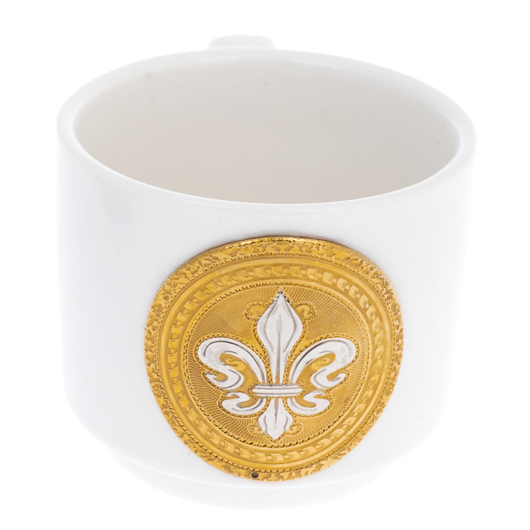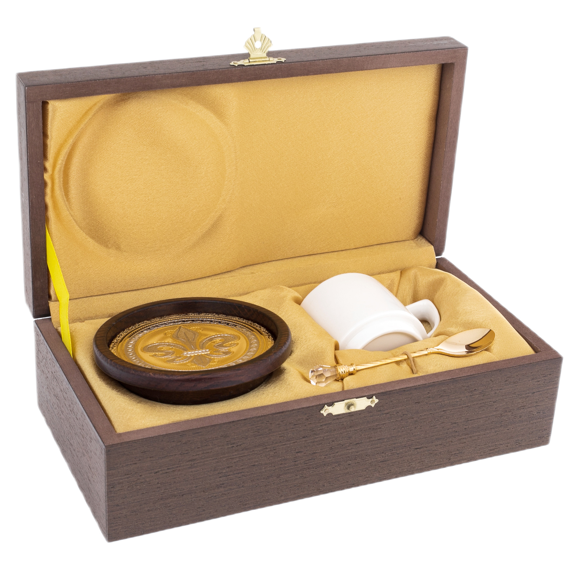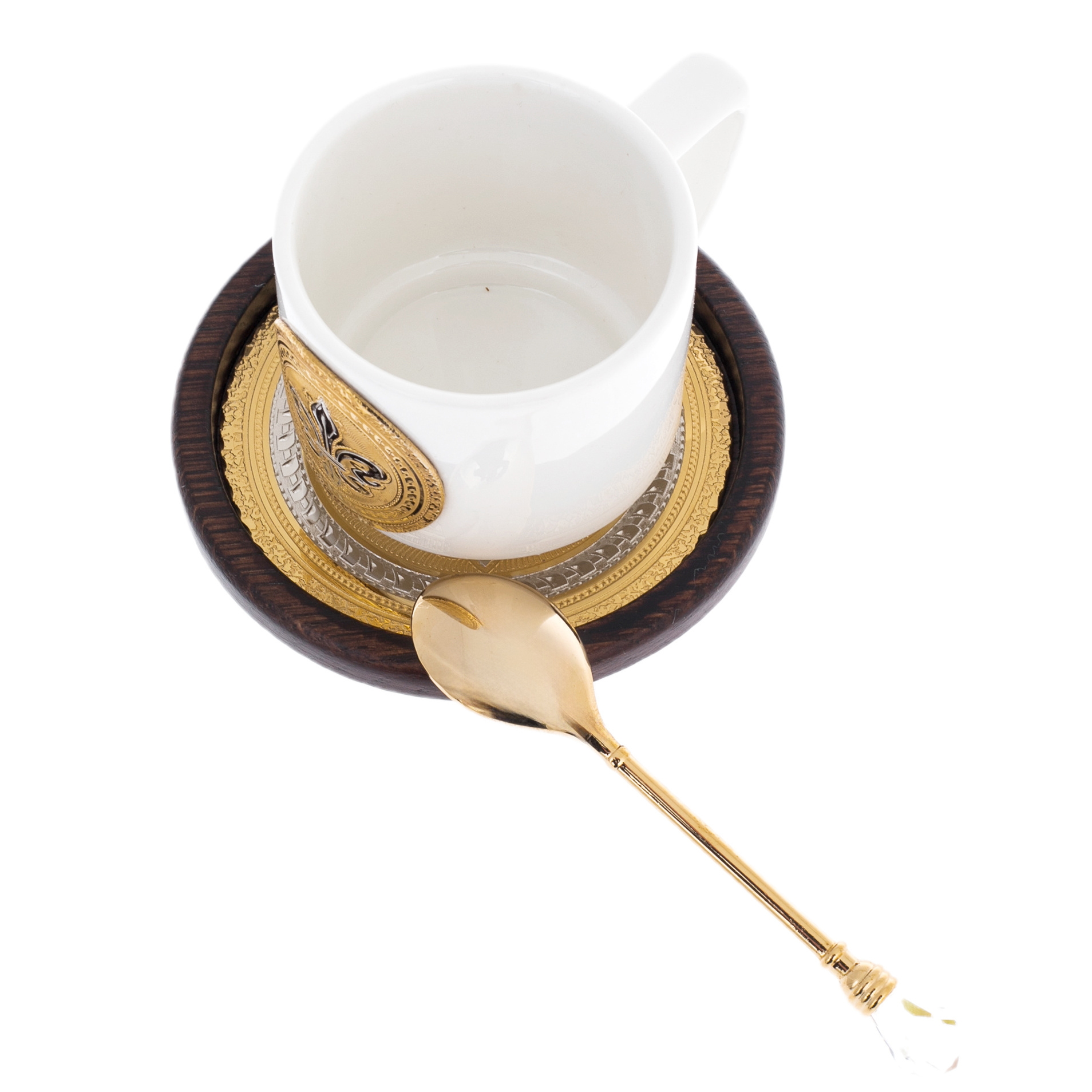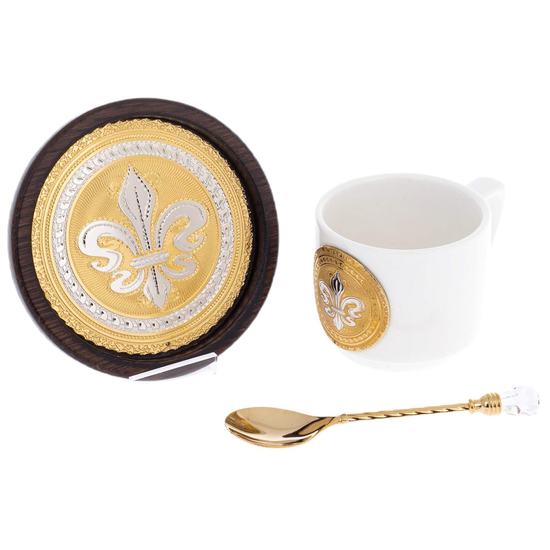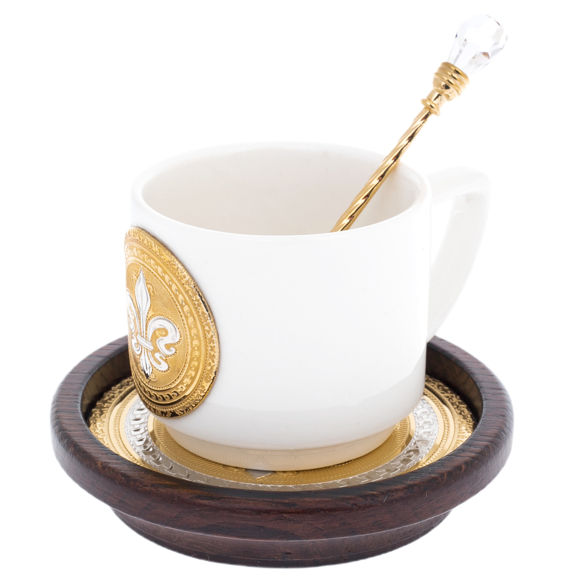 Кофейная пара «Люкс» на одну персону — это изысканный утренний ритуал, облечённый в форму искусства. Составленный из фарфоровой чашки, деревянного блюдца с металлической вставкой и ложки с кристаллом на торце, комплект предназначен для тех, кто привык начинать день не просто с кофе, а с наслаждения эстетикой. Центром композиции служит гербовая медаль с геральдической лилией — символом благородства и власти, выполненная в золоте и серебре. Ложка с витой ножкой и прозрачным навершием придаёт ансамблю оттенок ювелирного изящества, достойного интерьеров высшего света.