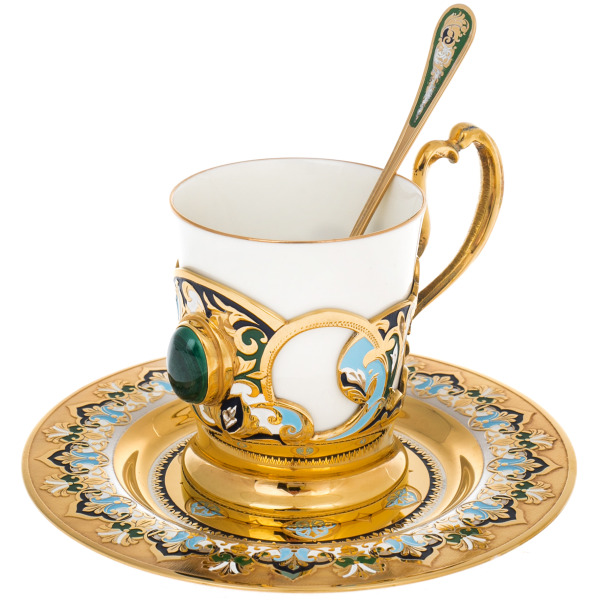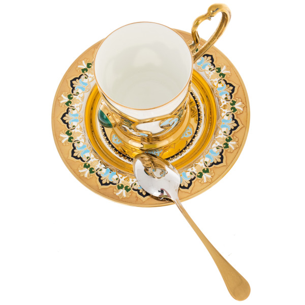 The Rassvet coffee set is the epitome of a solemn ritual aimed at those who are used to starting the day with elegance. The set includes a cup, saucer and spoon, decorated in the same style. The snow-white porcelain is framed by a gilded brass frame with rich enamel, forming elegant floral motifs. Every line, every detail seems to be created in order to emphasize the importance of the moment — whether it's a morning coffee alone with thoughts or a leisurely conversation in the silence of your personal account.