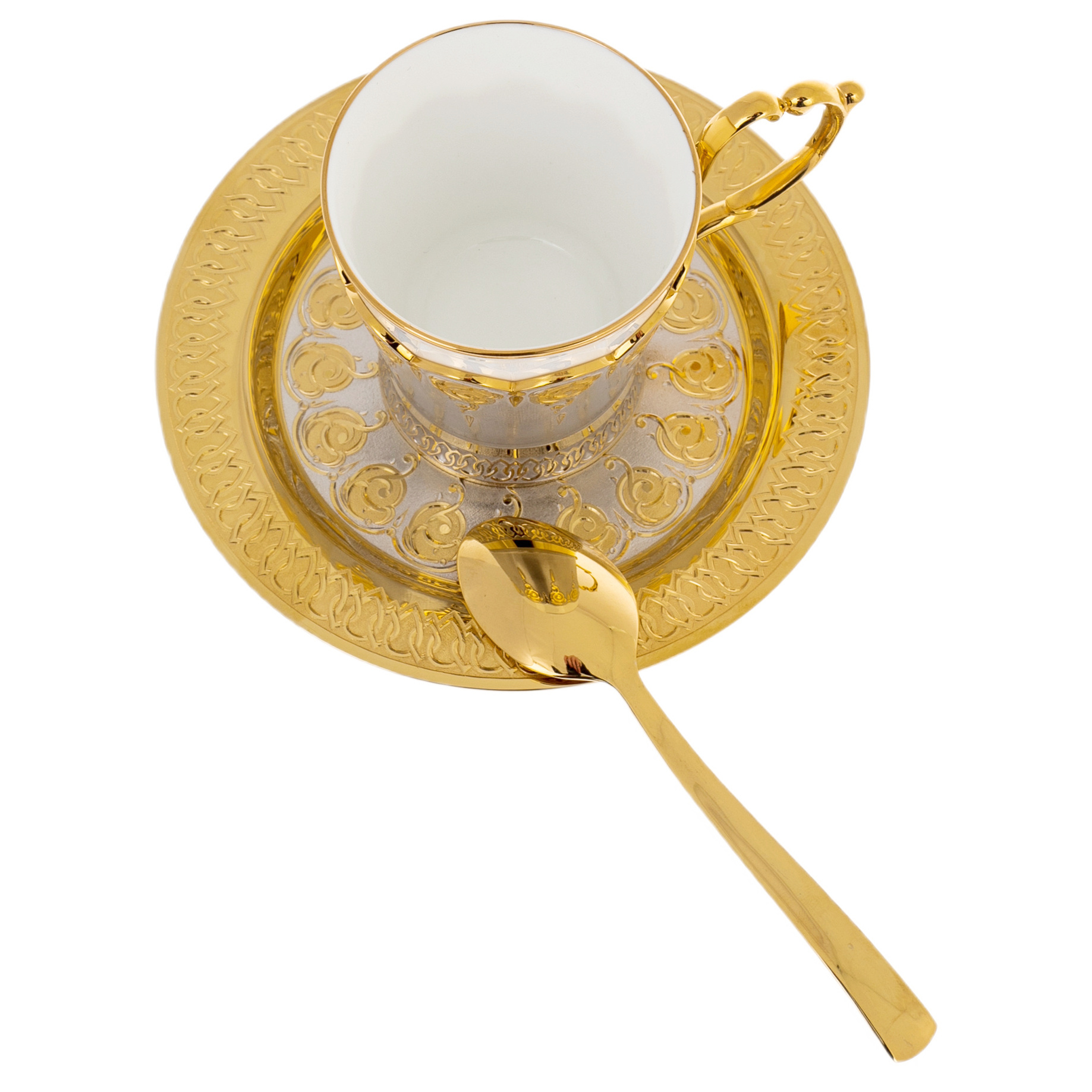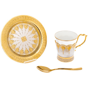 Чашка выполнена из белоснежного фарфора с тонким золотым кантом по краю, придающим линии лёгкую торжественность. Внешнюю часть охватывает металлическая оправа с мягким серебристым блеском, украшенная золочёным орнаментом: стилизованные розовые завитки сходятся в ритмический пояс, подчёркивая форму и создавая эффект ювелирного кружева. Ручка из металла покрыта позолотой, изогнута плавно и изящно, обеспечивая удобный захват и поддерживая общий характер изделия. Блюдце выполнено в широком формате, по ободу проходит богатый декоративный фриз с повторяющимся узором, центральное поле заполнено орнаментальными мотивами, согласованными с рисунком на оправе чашки; сочетание зеркальной полировки и гравированных участков создаёт игру света, особенно выразительную при вечернем освещении. Ложечка, поставленная в чашку, продолжает линию комплекта: гладкая золочёная поверхность подчёркивает парадность подачи и завершает ансамбль цельным акцентом.