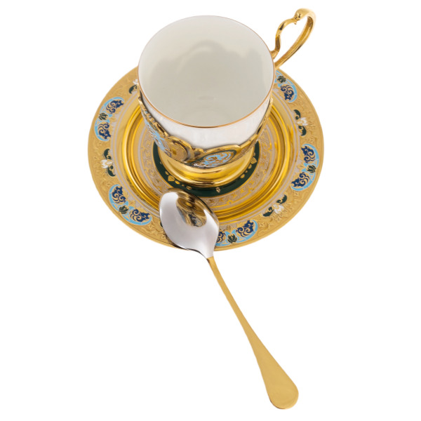 The spoon, being the completion of the ensemble, radiates the elegance of its shape and decor. The gold plating and ornamental details make it not just a utilitarian object, but part of a ritual where every movement carries nobility and sophistication.