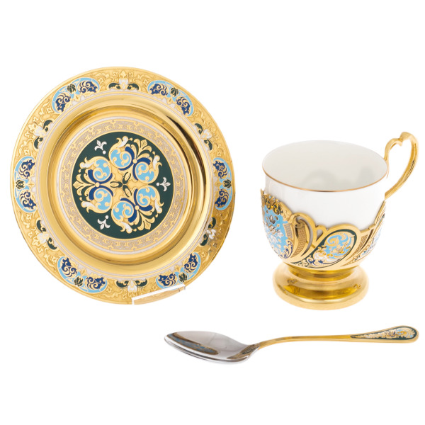 The saucer, sparkling with gilding, reflects the grandeur and harmony of the set. The ornaments, applied with amazing precision, seem like flowers blooming under the first rays of the sun. A deep green background complements the palette, creating a game of shades that attracts the eye and gives aesthetic pleasure.