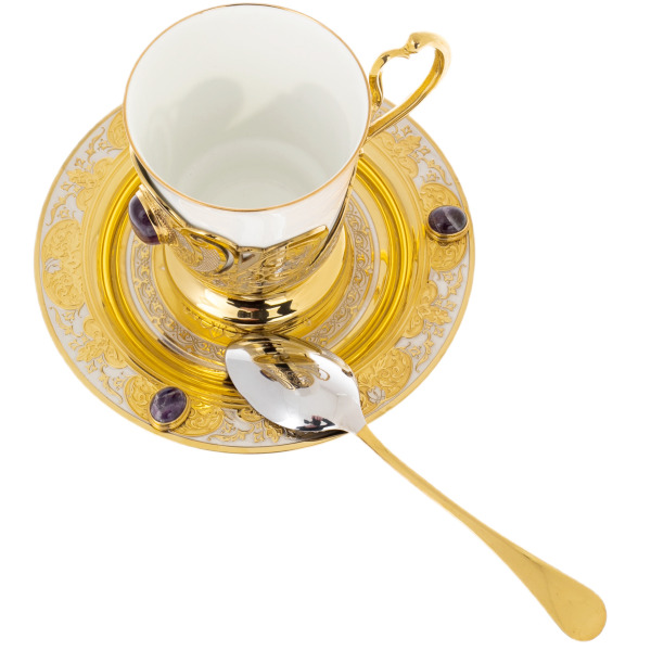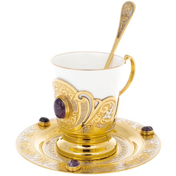 The Morning coffee set with amethyst is the epitome of sophistication and harmony at the beginning of the day. Snow-white porcelain, framed by gilding and the finest engraving, creates a feeling of light and warmth, as if the first rays of the sun touch the metal surface. Purple amethyst stones add a noble sound to the composition, symbolizing clarity of thought and inner peace.