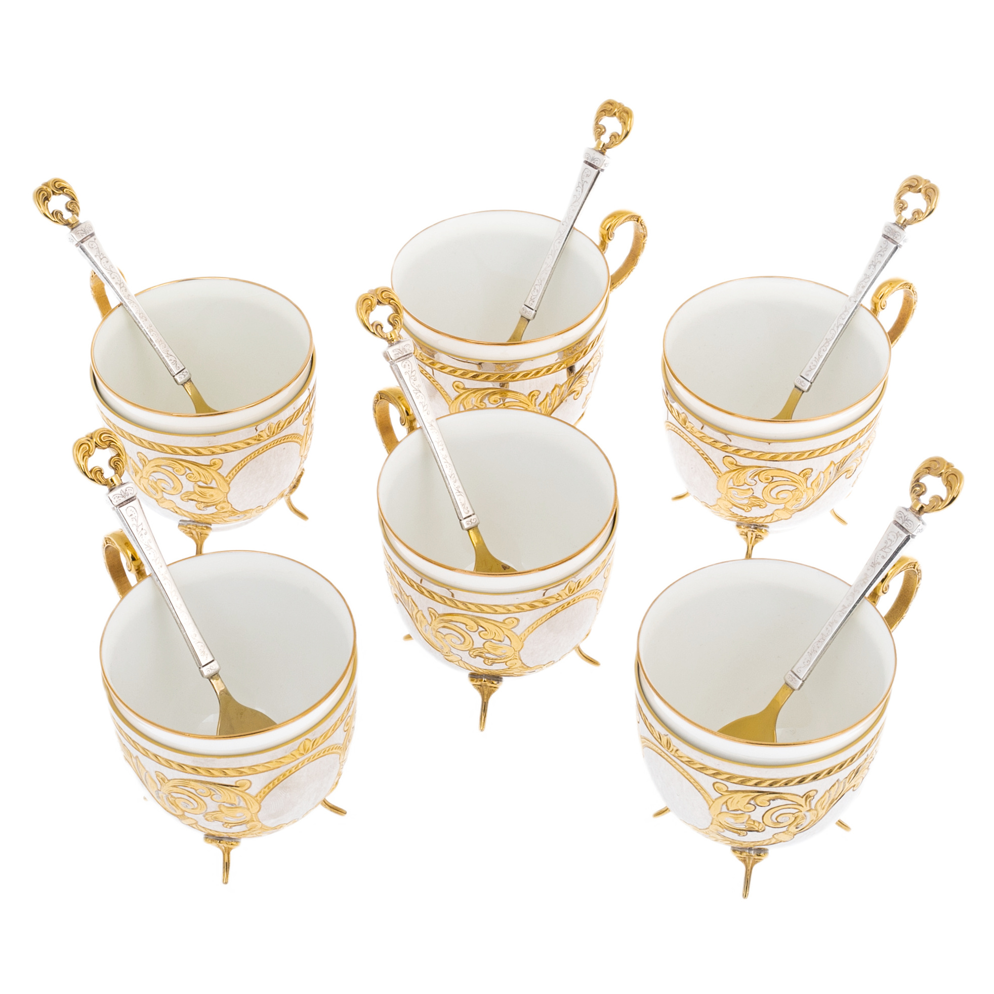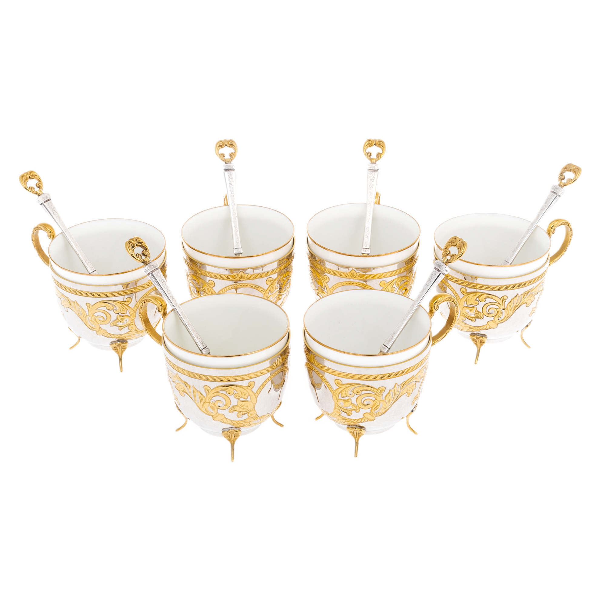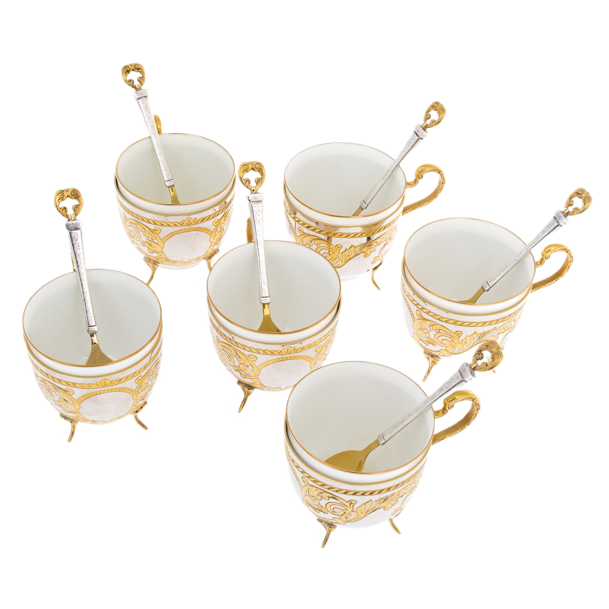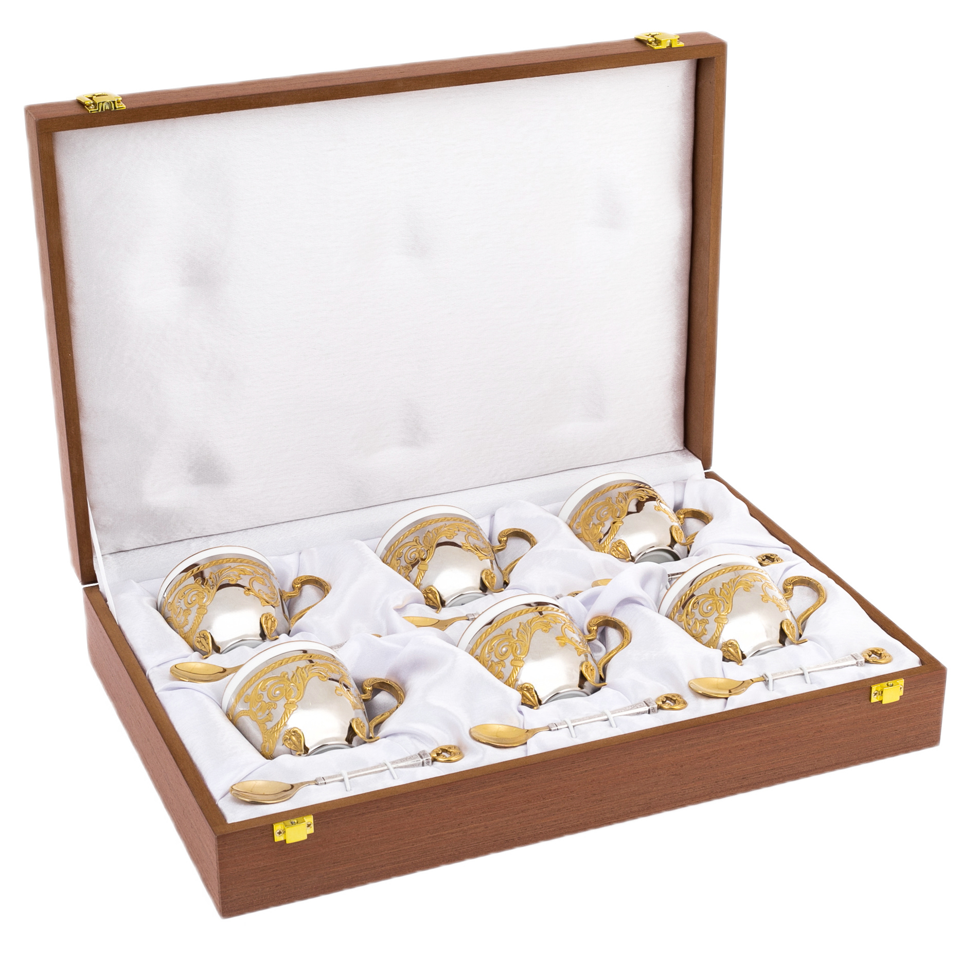 Кофейный набор на 6 персон из Златоуста — блистательное воплощение утончённого вкуса и высочайшего мастерства. Каждая пара включает фарфоровую чашку с внешней оправой из никелированной латуни, украшенной позолоченными орнаментами, изящными ручками и ножками, а также ложку с серебряным стержнем и позолоченной чашей. Богато декорированные элементы, обрамляющие белоснежную керамику, подчёркивают дворцовый стиль предметов и превращают сервировку в настоящую церемонию. Гармония золота, серебра и фарфора делает каждую чашку произведением прикладного искусства. Набор представлен в элегантном футляре, выложенном белым атласом — решении, подчеркивающем ценность подарка.