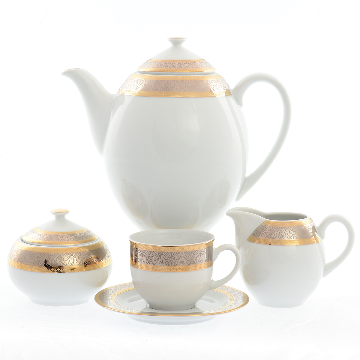 The composition of the set:coffee pot with lid 1.20 l - 1 pc; milk jug 180 ml - 1 pc; sugar bowl 220 ml - 1 pc; cup 90 ml - 6 pcs; saucer 14 cm - 6 pcs;