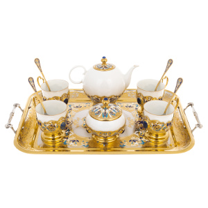 Blue Leaves coffee set for 6 peopleBlue Leaves coffee set for 6 peopleCloisonne enamel is an ancient skillful method of decorating metal surfaces, which gives objects a unique charm. Shining cutlery, exquisite tableware and elegant decorations, made in a unique way, have become an integral part of the interior and style in our time. The splendor of cloisonne enamel attracts the eye and causes delight. Bright and juicy colors, ornaments and patterns are all essential signs that you have in front of you a product that will add charm and sophistication to your home, decorate it and create an atmosphere of comfort. The harmony of shape and color, the fine elaboration of details make each piece of the collection a real work of art, emphasizing the refined taste and unsurpassed style of the owner. Enameled objects of various colors will delight you with their unique beauty every day, reminding you that art can be a part of your life.