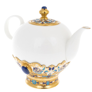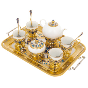 The Lily of the Valley coffee set with lapis lazuli for 4 people is a refined embodiment of the harmony of porcelain and metal, created by the masters of Zlatoust. The snow-white cups in a gilt brass frame, inlaid with sky-blue lapis lazuli, seemed to combine the purity of a spring flower and the grandeur of a precious stone. The set includes a coffee pot, a sugar bowl, four cups with spoons and a tray, every detail of which shines with grace and thoughtfulness of form.