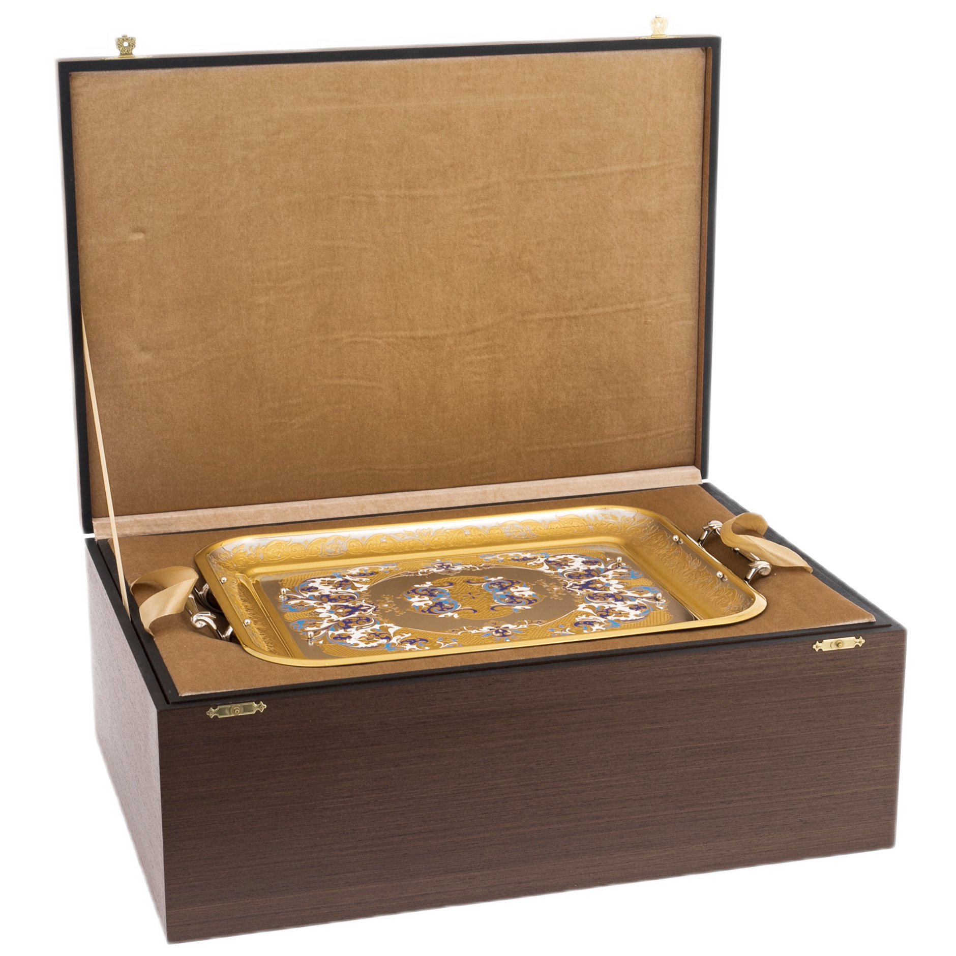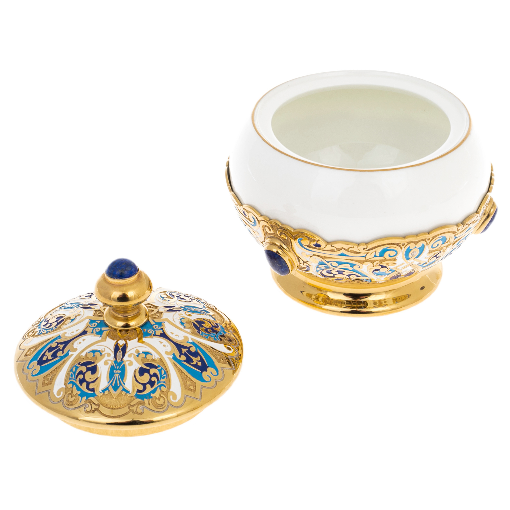 The technique of Zlatoust metal engraving, complemented by hot enamel, fills the composition with subtle ornamental iridescences, creating a play of color and light. Gold, deep blue and white form a noble palett