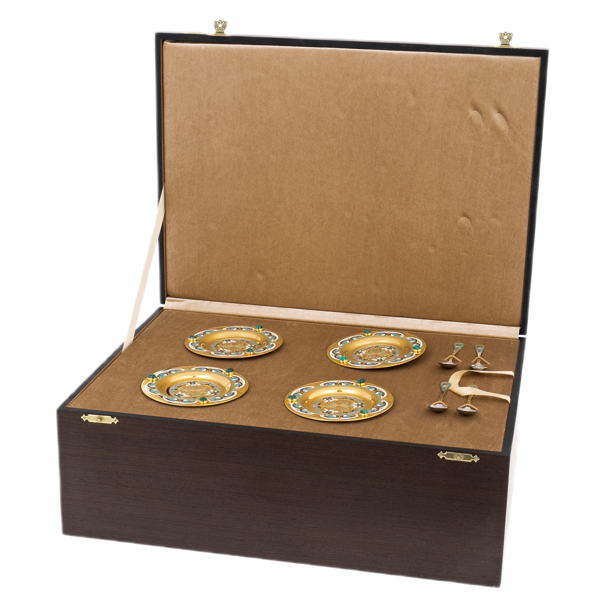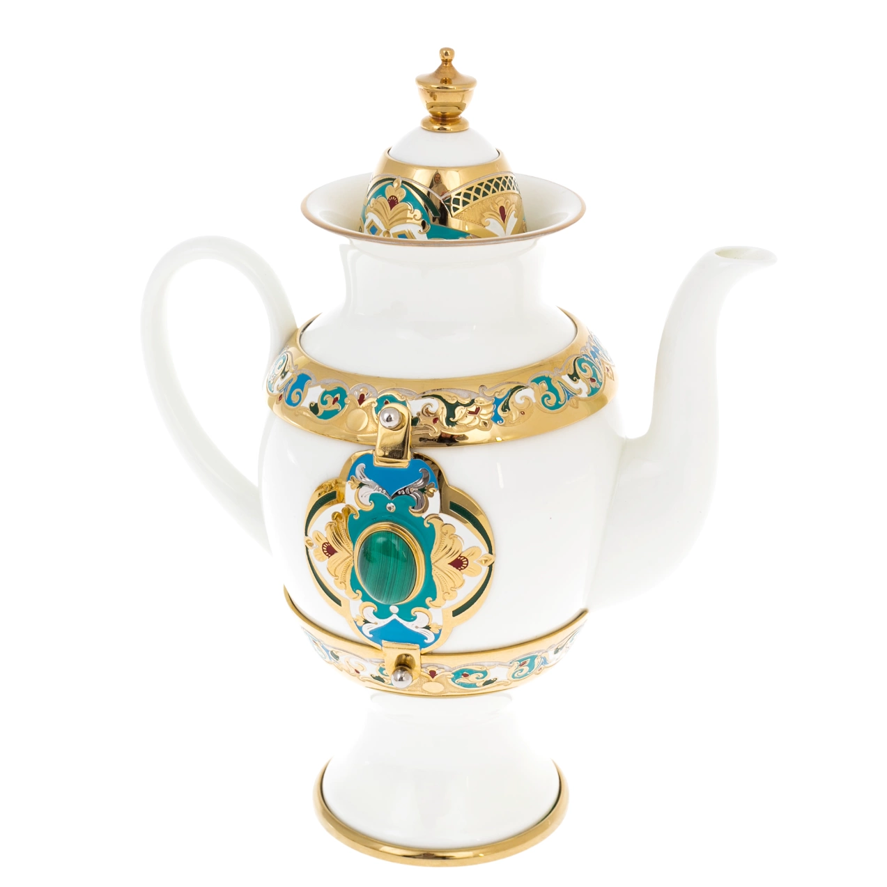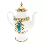 Кофейный сервиз «Боярыня» на 4 персоны, созданный мастерами Златоуста, — парадный ансамбль, в котором фарфор, художественный металл и цветная эмаль соединены в цельный образ благородной роскоши. В состав входят кофейник, сахарница, сливочник и четыре кофейные пары с ложками. Белоснежная основа фарфора подчёркивает богатство золочёного декора и глубоких бирюзово-изумрудных акцентов, формируя выразительный, запоминающийся силуэт.
