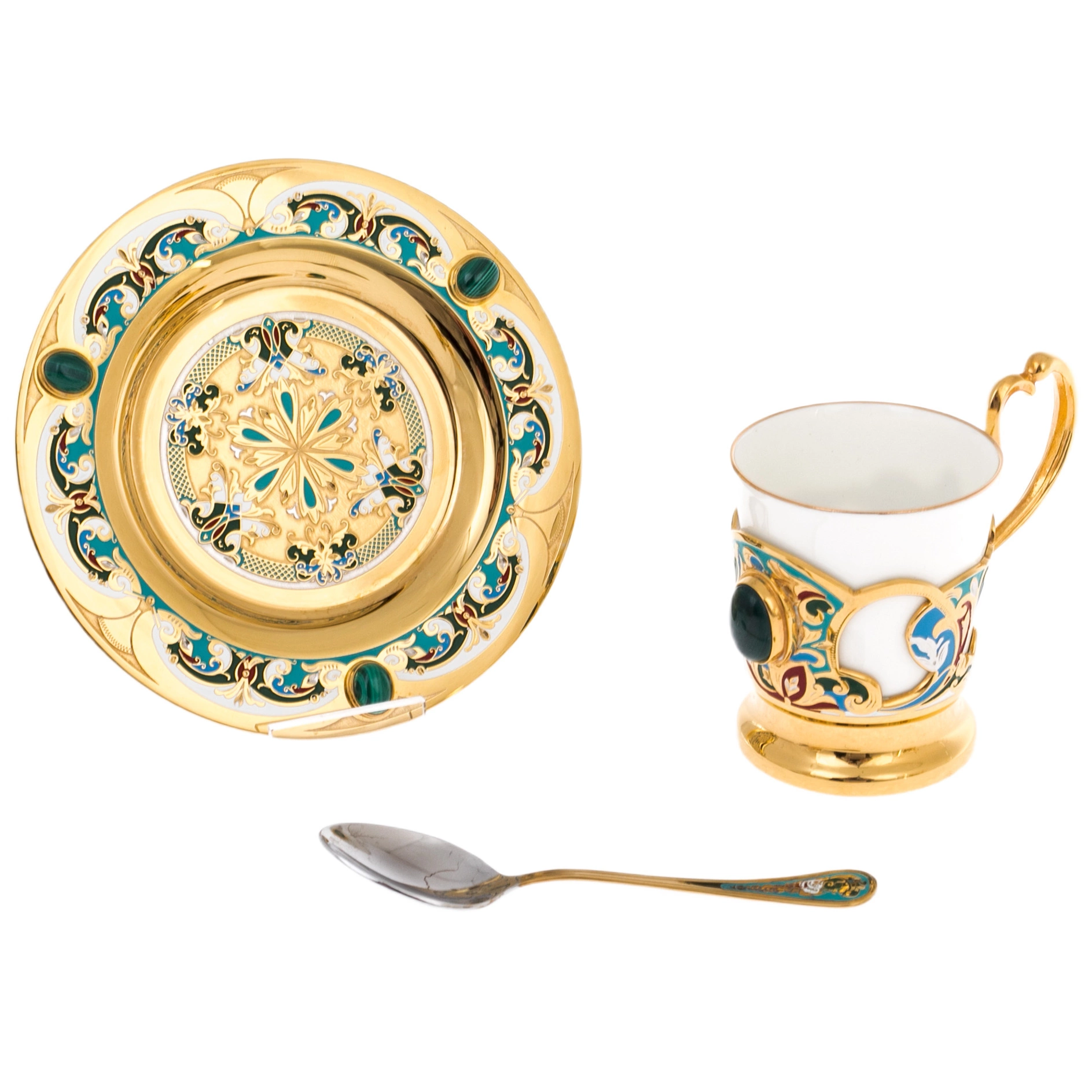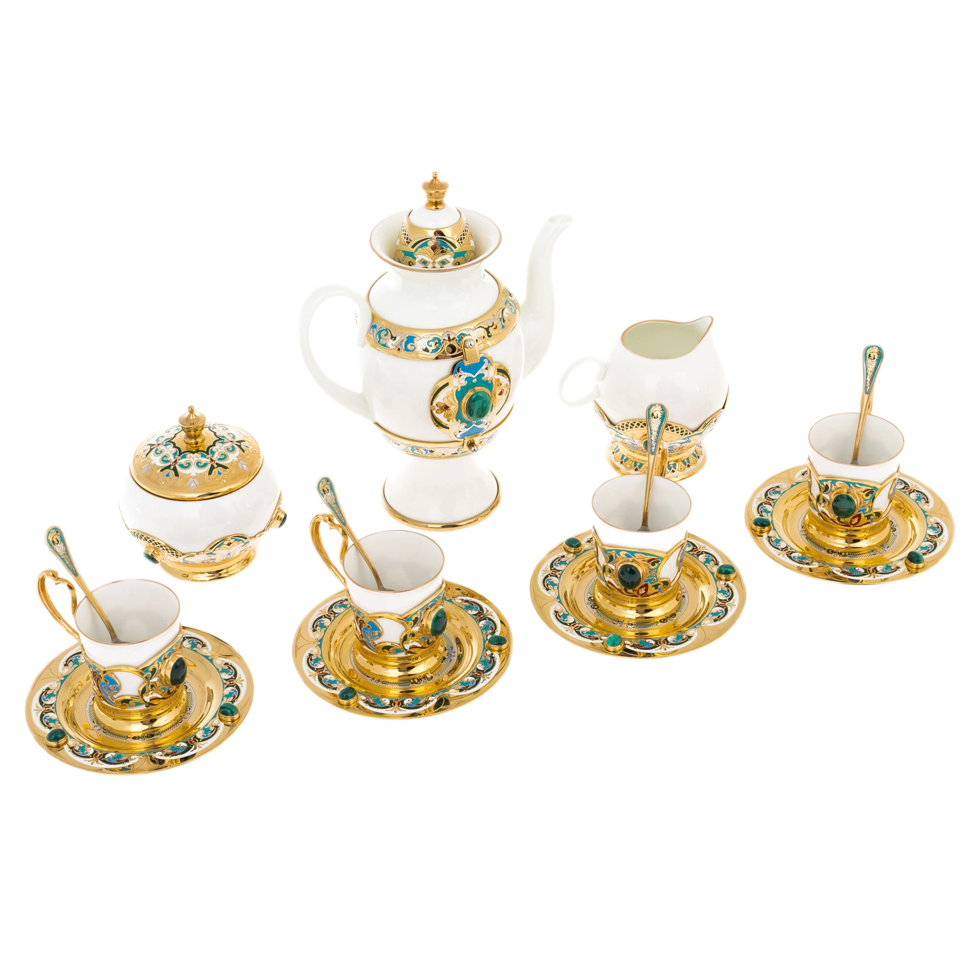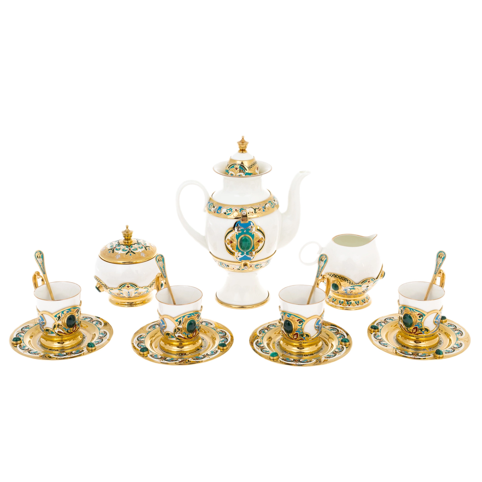 Металлические накладки, выполненные в технике златоустовской гравировки и золочения, украшены растительными орнаментами с плавными линиями и тонкой прорисовкой. Центральные вставки с насыщенными зелёными камнями создают ощущение драгоценной инкрустации, усиливая торжественный характер сервиза. Декоративные пояса на подстаканниках и блюдцах образуют единый ритм, а ручки и крышки завершены аккуратными золочёными элементами, подчёркивающими внимание к деталям. Контраст блеска металла и матовой глубины эмали придаёт композиции объём и выразительность.