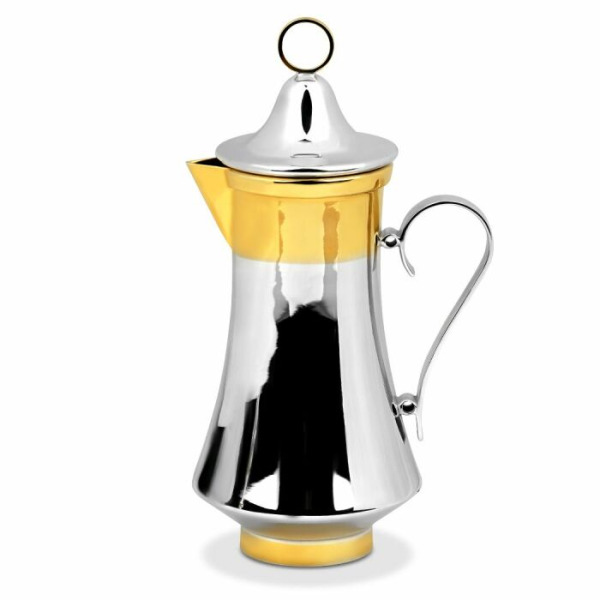 Each element of the set — coffee pot, sugar bowl, elegant creamer, cups with saucers and spoons — is created with unsurpassed attention to detail. Cast in pure silver, the objects are decorated with delicate relief patterns of silver threads framed in gold, which gives them an exquisite contrast and a warm glow.