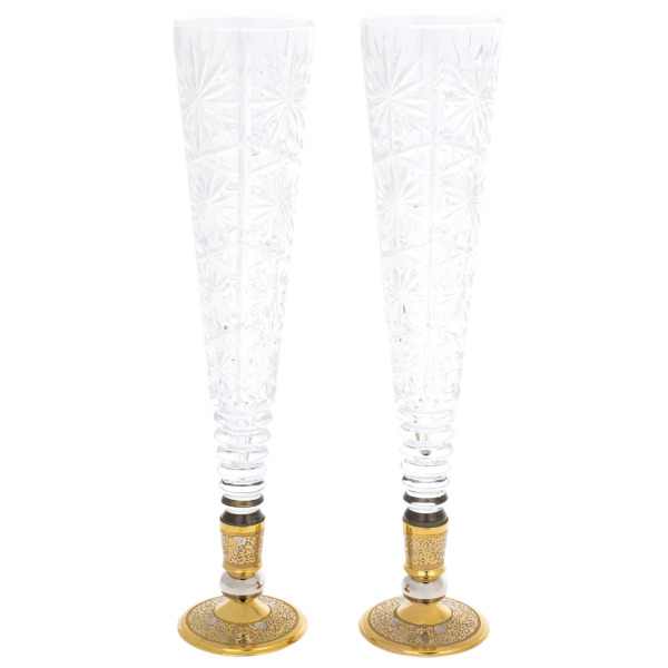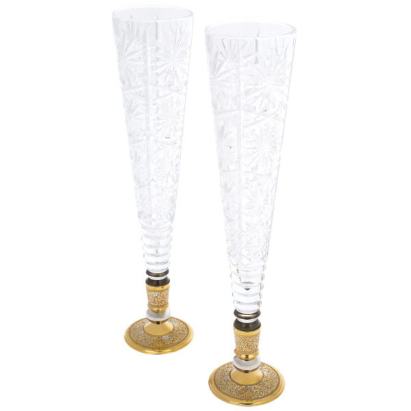 This set of crystal champagne glasses is a true masterpiece of luxury and sophistication, created for those who appreciate not only the quality, but also the uniqueness of the items. Imagine: two tall, transparent glasses with thin walls, made of the purest crystal, which reflects light with a multitude of highlights, like small stars in the sky. Each wine glass is decorated with artfully engraved radial patterns that create a sense of dynamics and movement. The lower part of the glass is framed by a golden ring, and the base is complemented by a decorative element covered with a complex ornament where leaves and curls are intertwined, engraved with impeccable precision.