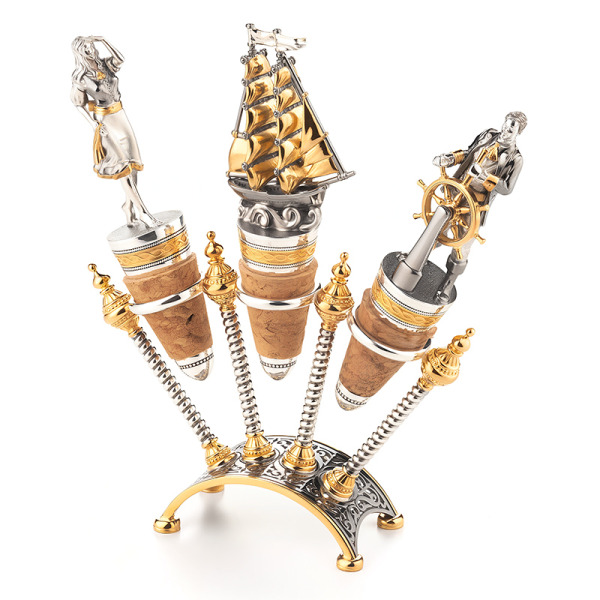 The trio of wine corkers has been specially prepared for the Scarlet Sails festival. The plug at the base of each accessory is removable. The set consists of three elements of Alexander Green's book: Assol, Captain Gray, Sailboat. The set is packed in a gift case and a shipping box.