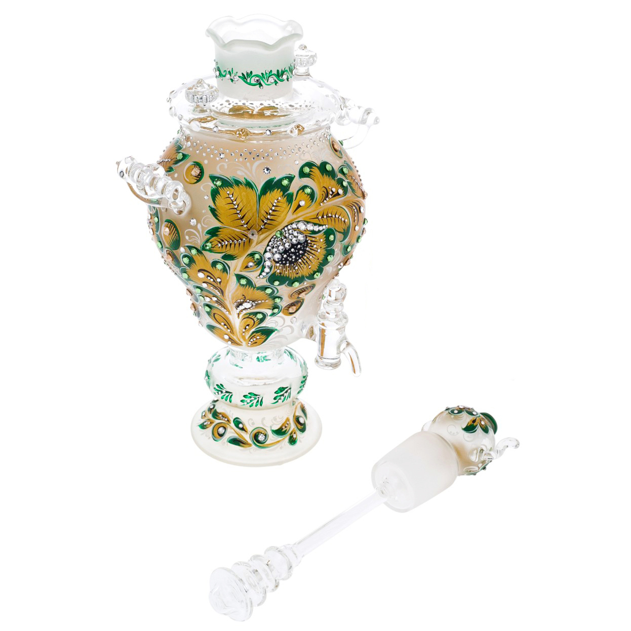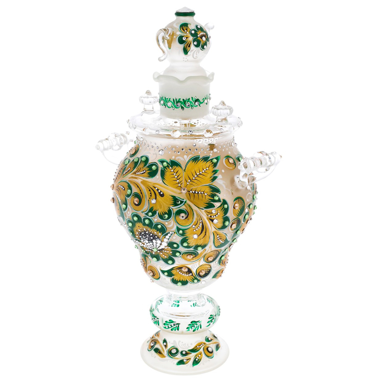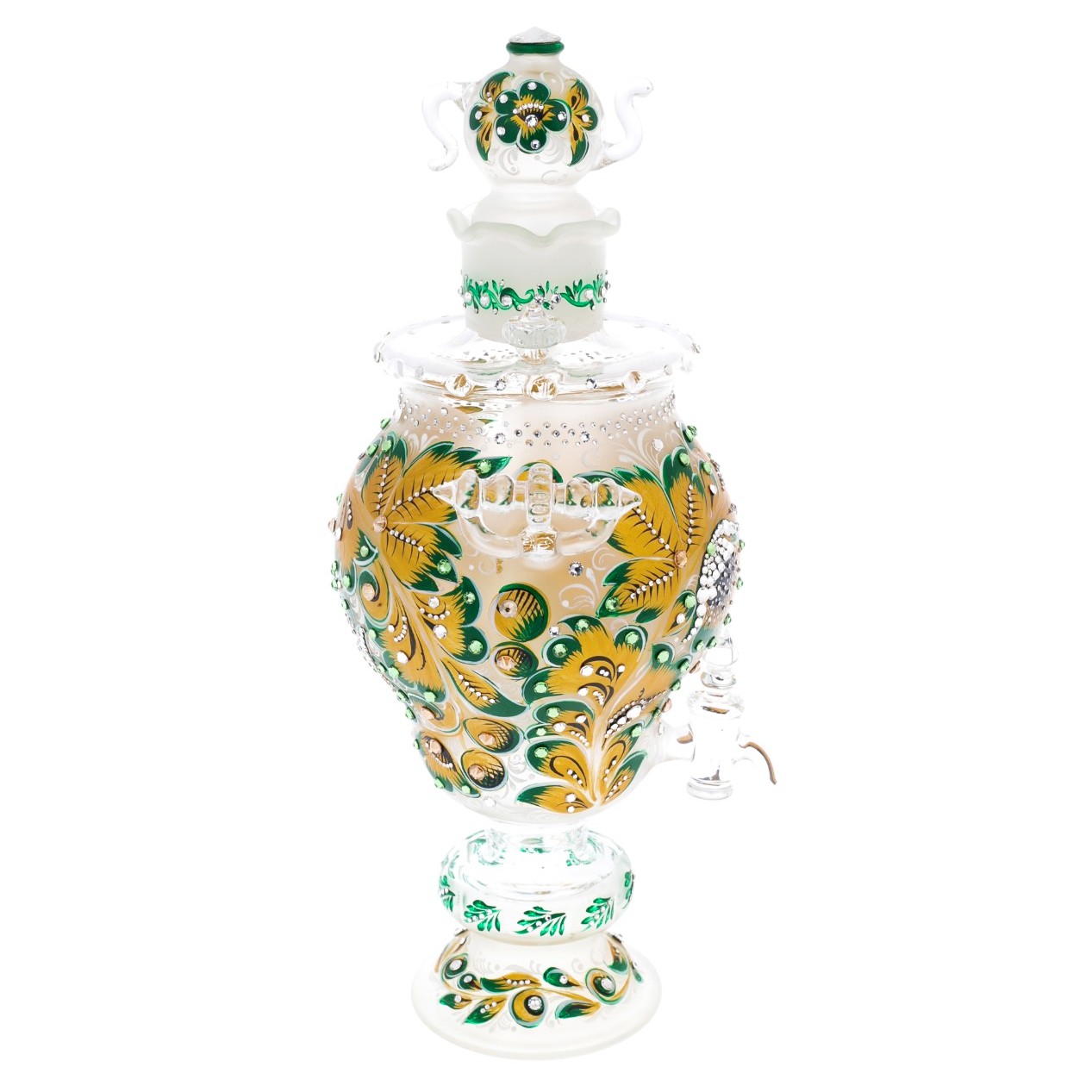 Golden Emerald glass honeydew samovar with Swarovski crystals, Khokhloma