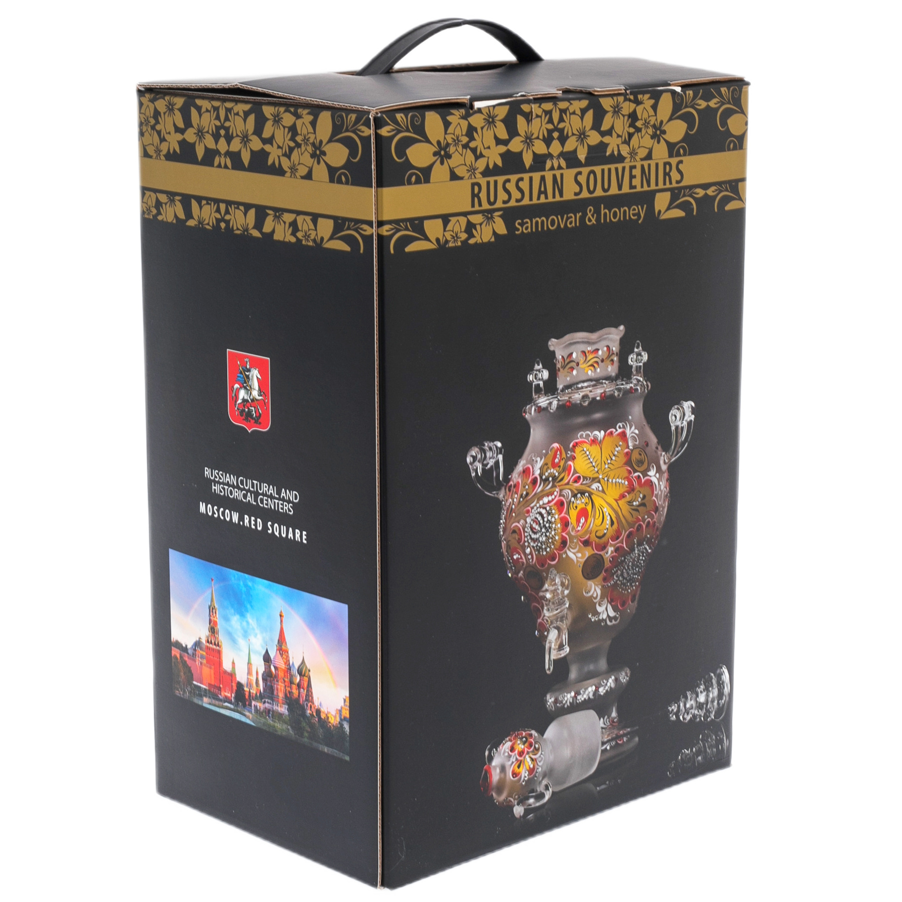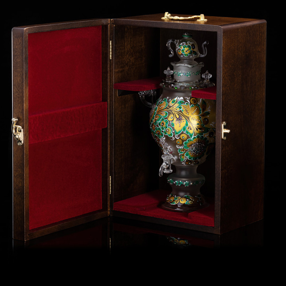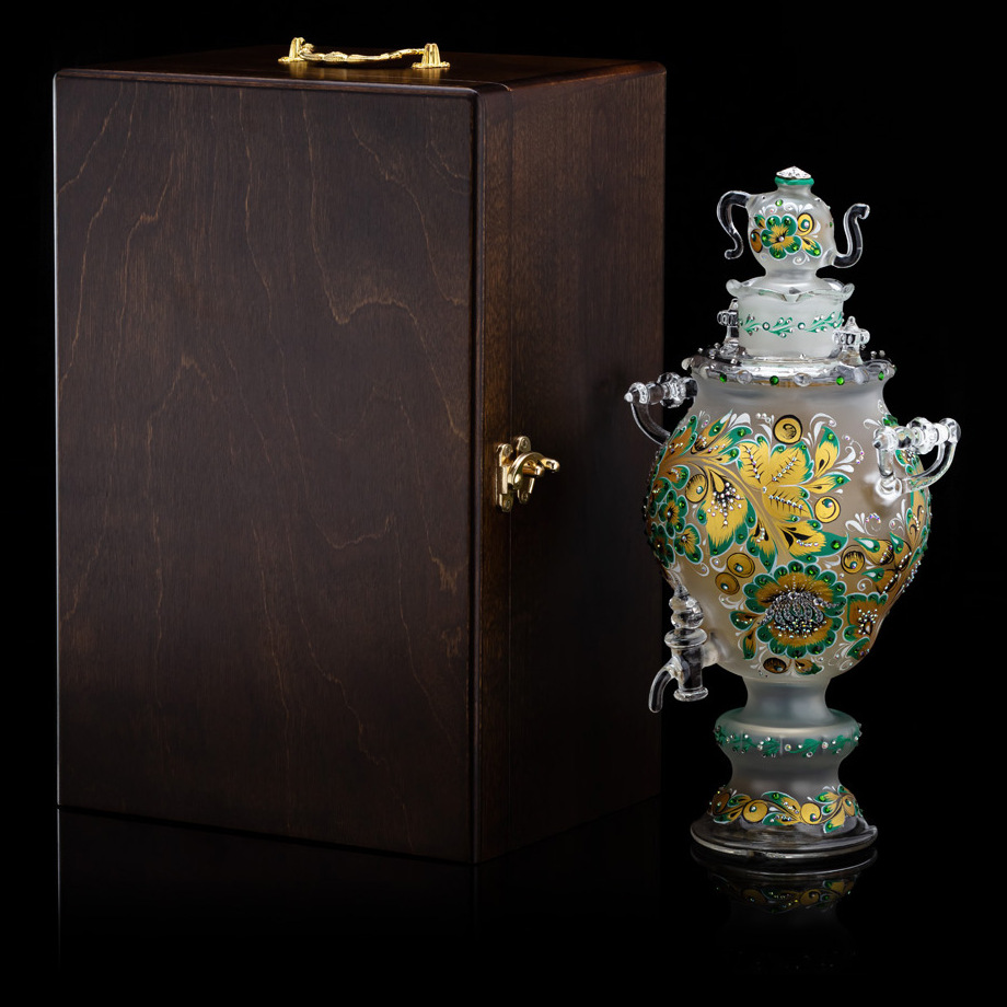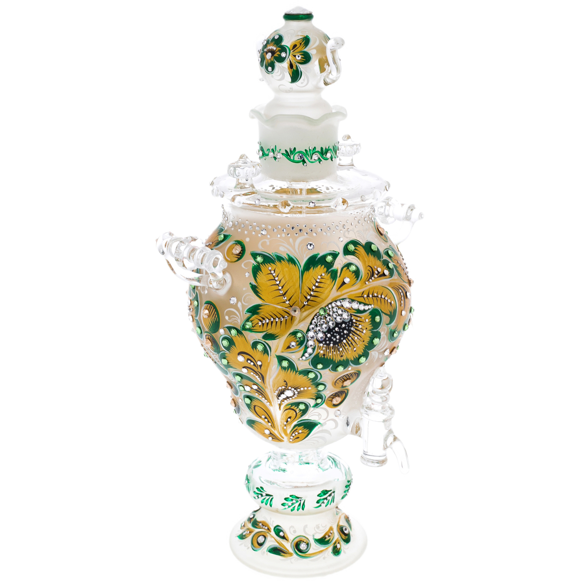 Golden Emerald glass honeydew samovar with Swarovski crystals, Khokhloma
