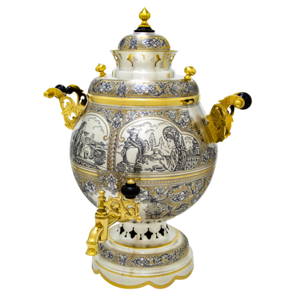 Samovar "Decorated" 3 liters, ZlatoustSamovar "Decorated" 3 liters, ZlatoustThe collections of fine tableware from the masters of Zlatoust are spectacularly decorated with painting, etching and gilding. After an elegant pattern is applied to the polished surface, the product is dried in an oven and processed, after which the pattern becomes embossed.