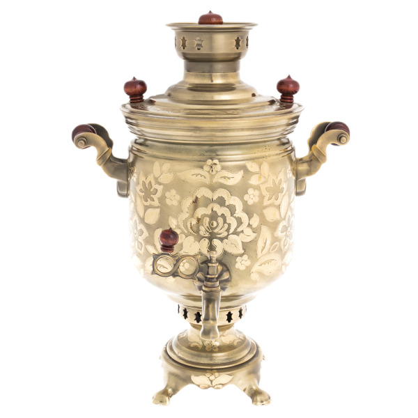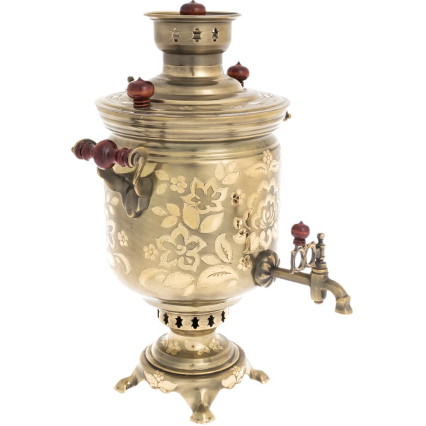 The Tsvetochek samovar radiates the noble warmth of the Russian tradition, taking on a new breath in its exquisite design. Made of brass and bronze, this combined samovar is designed for tea parties where not just the taste of the drink is appreciated, but the atmosphere of leisurely enjoyment, comfort and hospitality. It is ideal for country terraces, country houses and those who know how to turn a tea party into a ritual. The carved wooden handles and classic shape give the samovar a weighty elegance worthy of antique Russian interiors and modern collections with character.