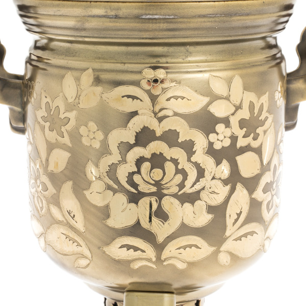 The metal body is decorated with floral ornaments, applied manually by the technique of engraving and embossing on brass. The floral pattern is made in soft satin gold, creating a play of light on the matte surface of the case. Each line is the result of the master's delicate work, which has achieved amazing depth even in laconic motifs. The slightly raised petals, leaves and stems seem to glow from within — the effect is achieved thanks to special etching and polishing with variable grain. Polished legs, a spout and a corolla crown the composition, emphasizing the aristocracy of the image.