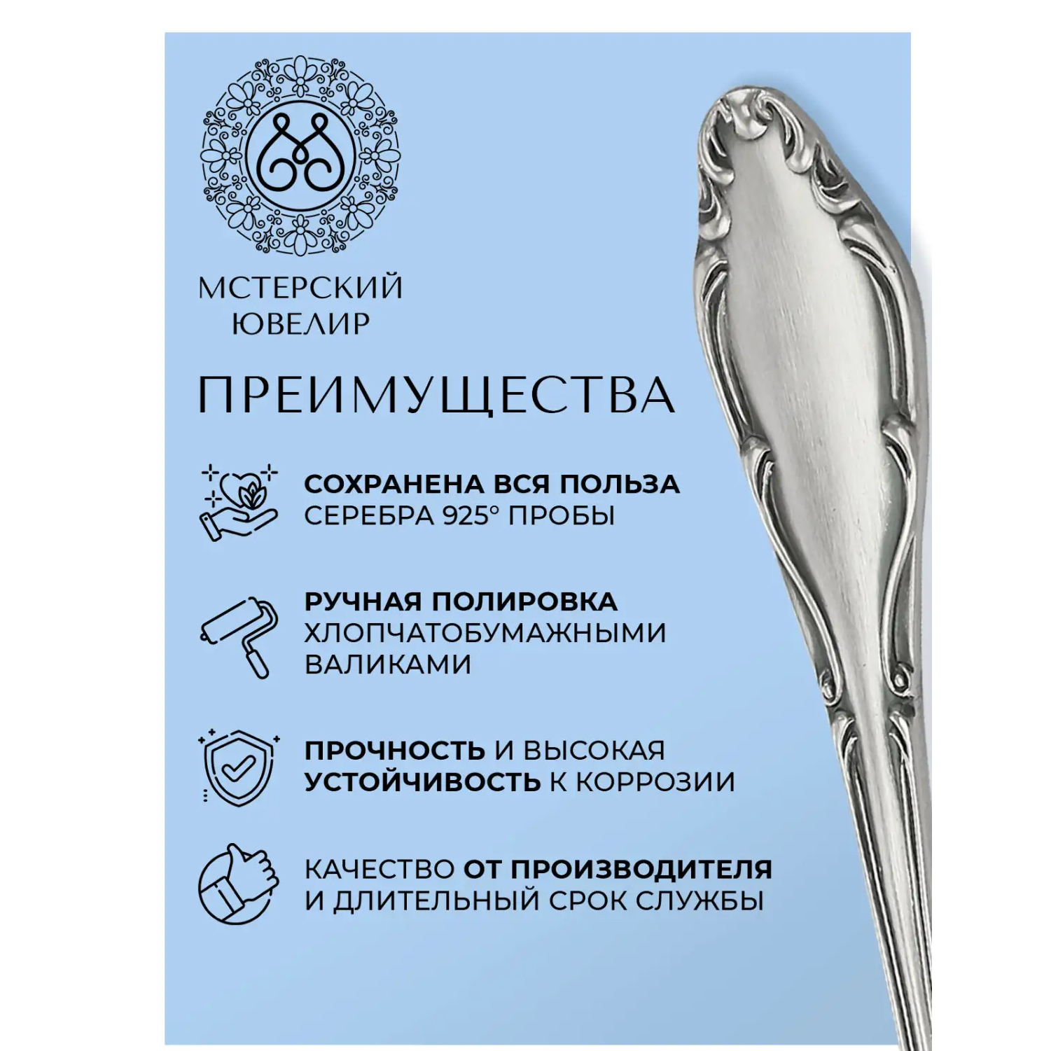 Изделия Мстерского ювелирного завода изготовлены из серебра 925 пробы. На изделии штампом нанесены два клейма: 1. Клеймо инспекции пробирного надзора, так называемая "проба" (содержит цифровое обозначение пробы драгоценного металла, в нашем случае - 925). 2. Фирменное клеймо предприятия, так называемый "именник" (содержит в себе информацию в виде буквенного шифра о годе выпуска изделия, наименовании производителя и знаке пробирного удостоверения). Наличие двух клейм на изделиях ("пробы" и "именника"), подтверждает факт подлинности изделия и принадлежности его к продукции ЗАО "Мстерский ювелир". Изделие изготовлено в строгом соответствии с ОСТ 117-3-002-95. Продукция завода всегда отличалась высоким художественным уровнем и качеством исполнения, пользуется неизменно высоким спросом как в России, так и за рубежом. При соблюдении необходимых рекомендаций изделие из серебра 925 пробы будет радовать вас и ваших близких не одно десятилетие, а благородный драгоценный металл, при надлежащем уходе и бережной эксплуатации, будет сохранять свои целебные свойства на протяжении всего срока службы.