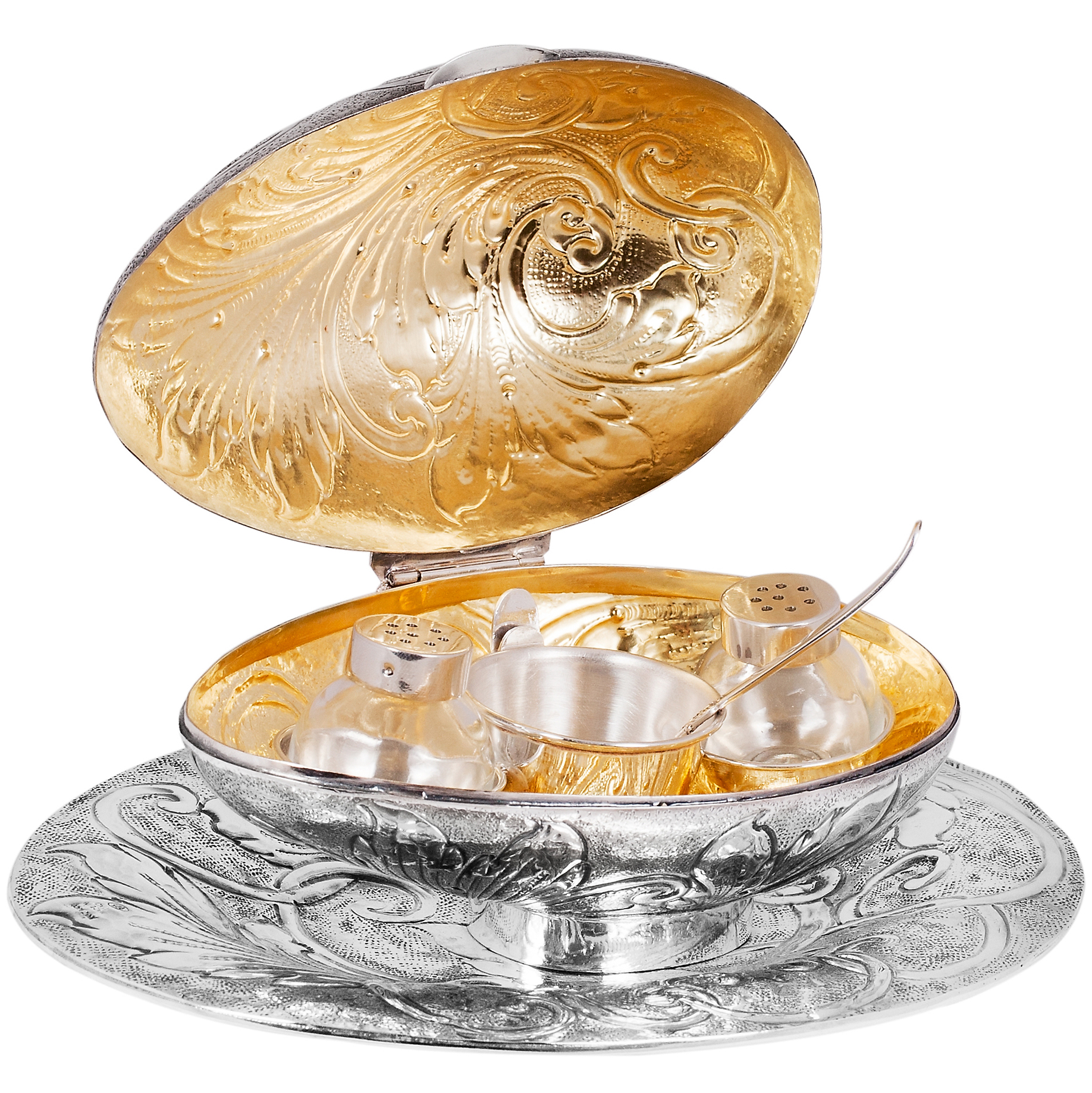 The Dvortsovaya egg set is an exquisite piece of jewelry art, embodying the sophistication and traditions of an aristocratic table. Inspired by the era of the great royal courts, this composition is made of silverware with the finest gilding, emphasizing its nobility and status. Every detail of the product is the result of painstaking manual labor, where engraving and embossing create an exquisite relief, filling the surface with a fascinating play of light.