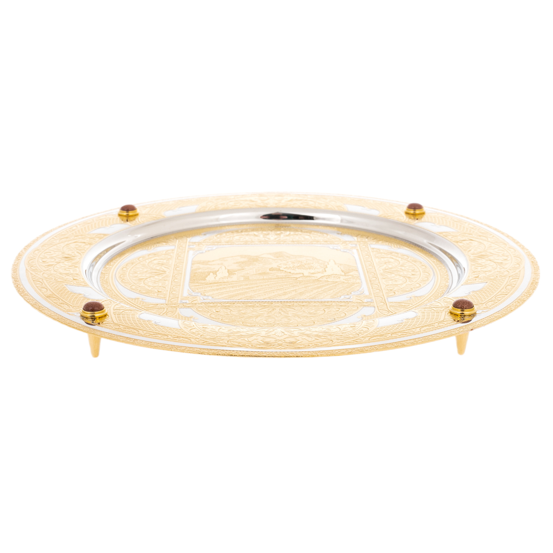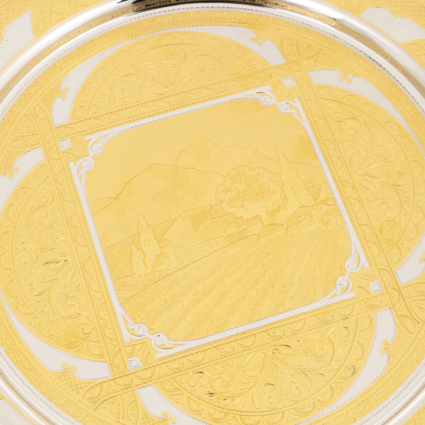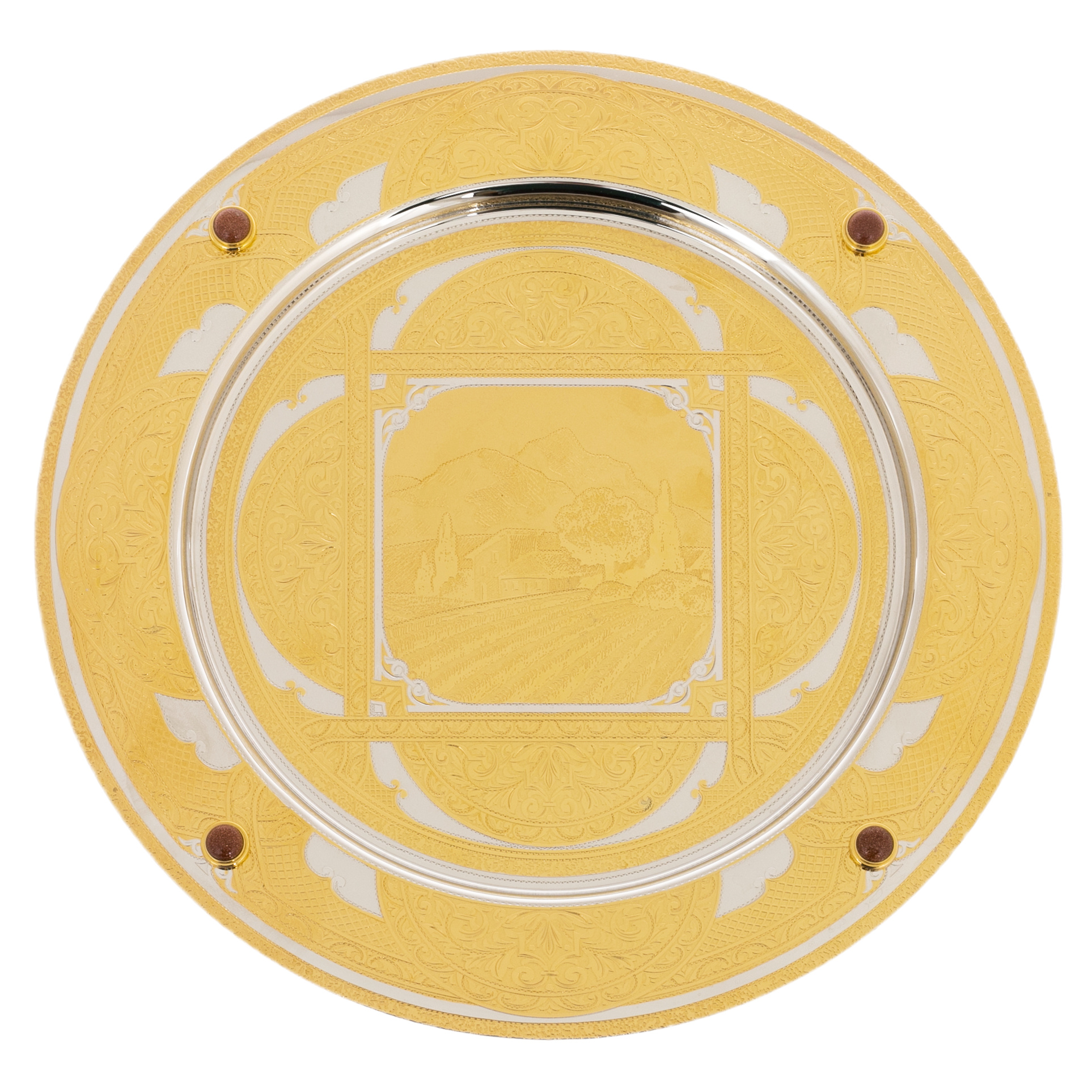 Подарочная тарель "Винодел" – произведение утончённого декоративного искусства, выполненное на стыке классической эстетики и высокой ювелирной техники. Симметричная композиция, обрамлённая изысканным растительным орнаментом, подчёркивает центр тарели, где гравированный пейзаж раскрывает идиллию винодельческого поместья: ряды лоз, величественные кипарисы, силуэт старинного дома на фоне мягких очертаний холмов. По краю разместились четыре круглых вставки из яшмы тёплого, благородного тона — камня, приносящего внутреннюю уравновешенность и ощущение гармонии.