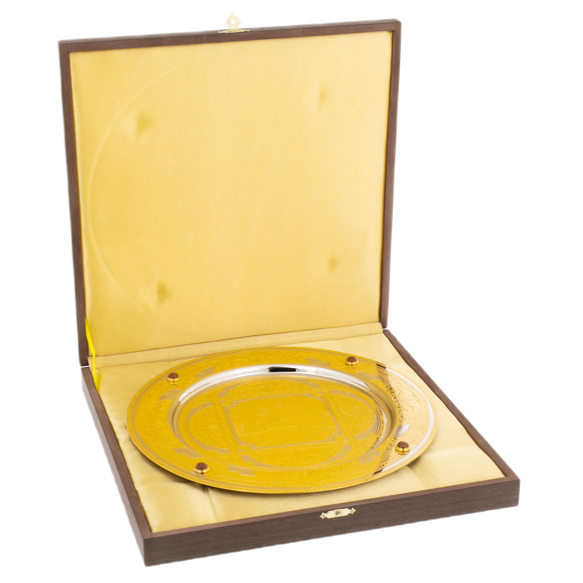 Тарель выполнена вручную в Златоусте — городе с почти двухвековой историей гравюры по металлу. Именно здесь мастера овладели техникой, сочетающей точнейшую ручную гравировку, травление, шлифовку, золочение и серебрение. Поверхность пластины украшена тончайшими узорами и фактурными рельефами, обрамляющими центральную часть. Художественное исполнение требует безукоризненной точности и многолетнего опыта: каждая линия, нанесённая вручную, служит не только декоративным элементом, но и частью целостного повествования, зашифрованного в металле.