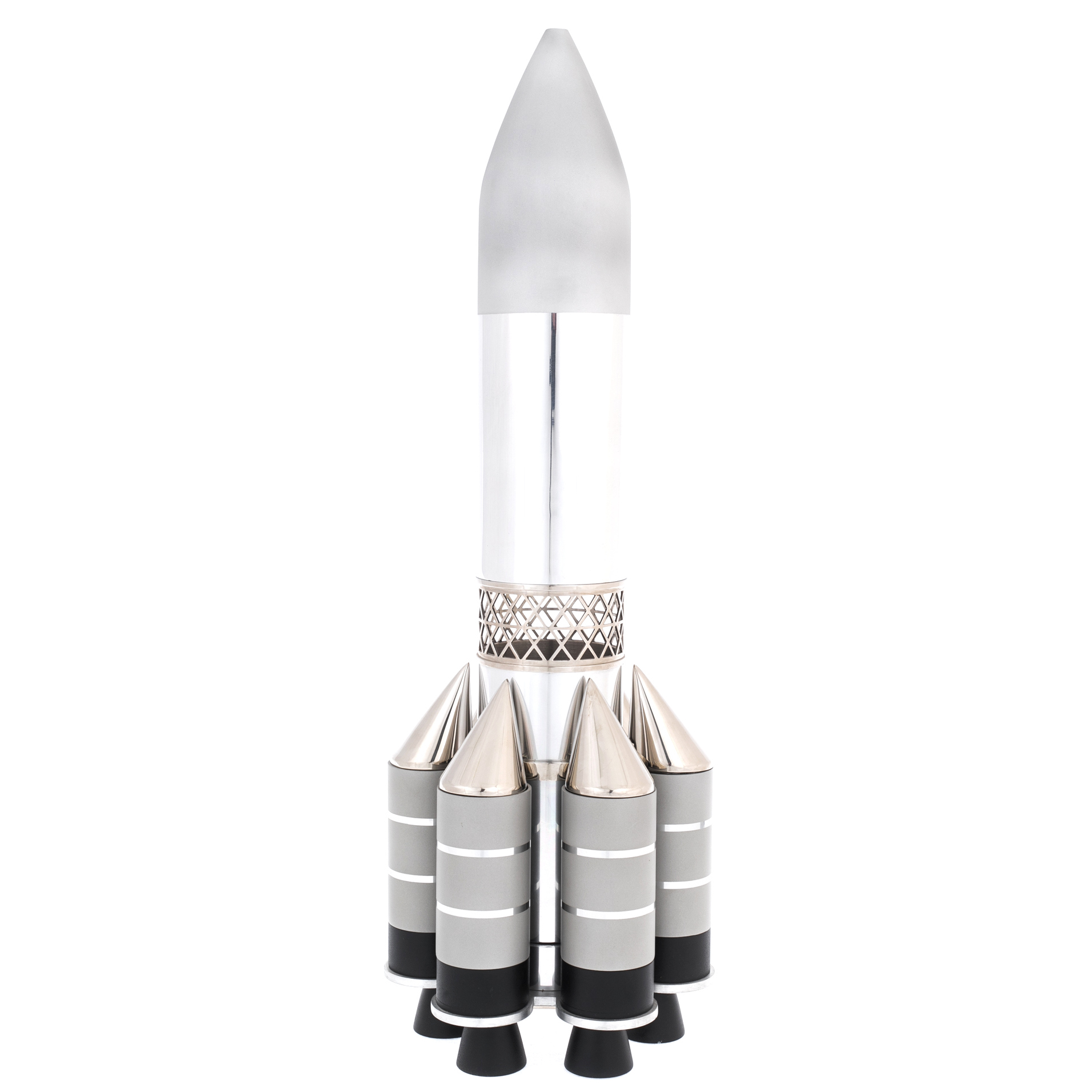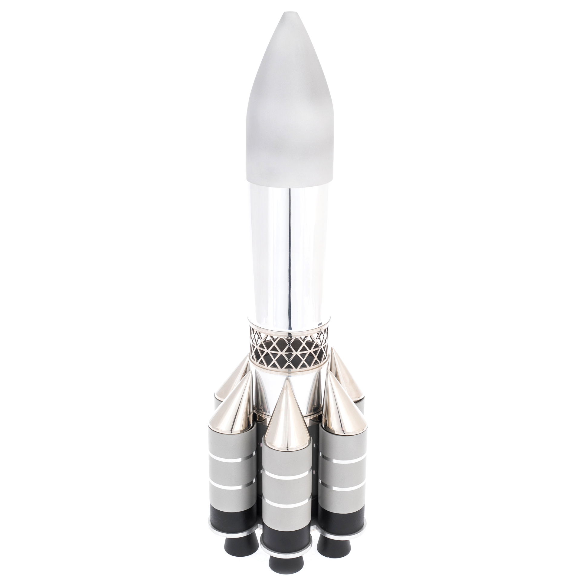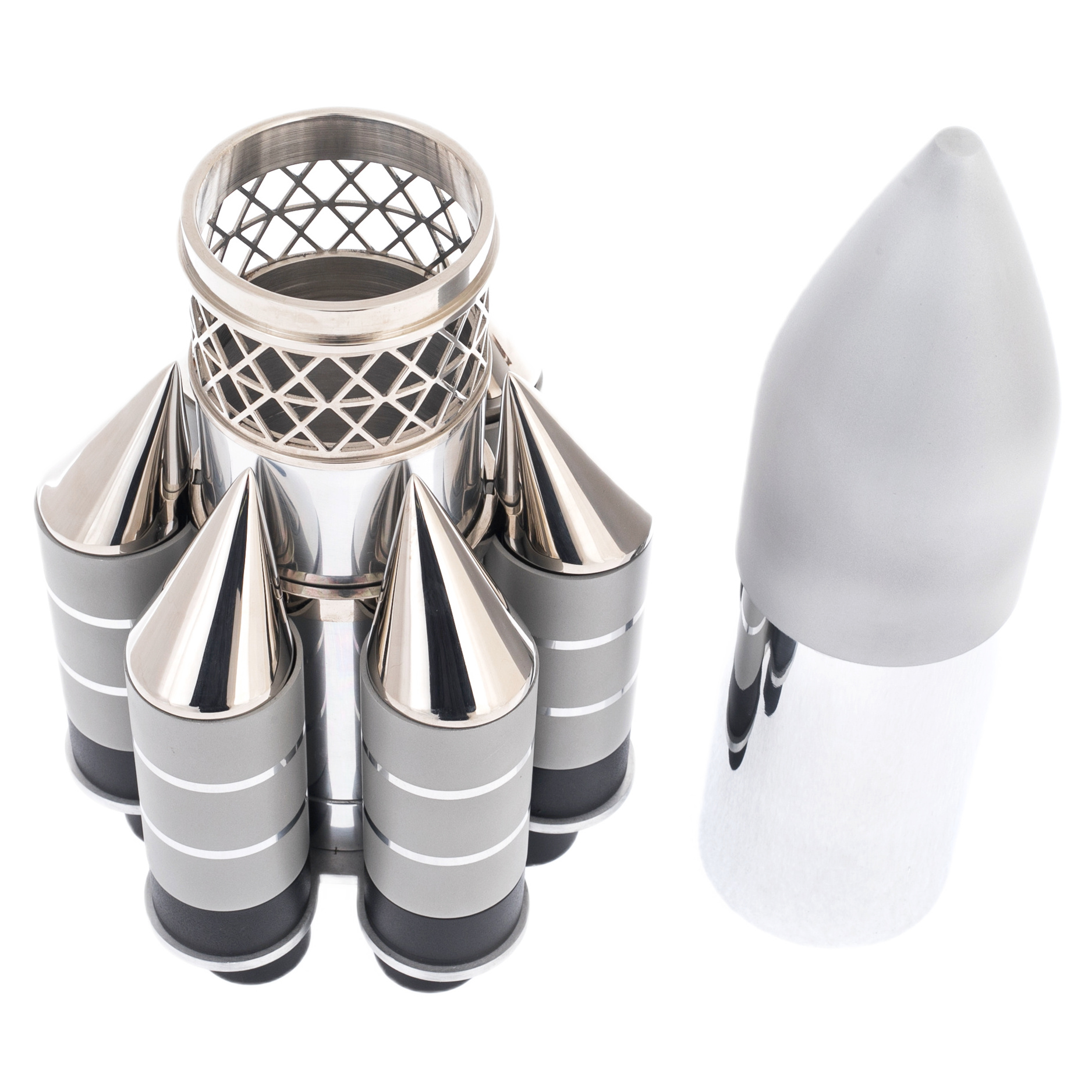 The shape of the rocket, perfect in its laconic geometry, evokes associations with the power of space launches and the conquest of unexplored horizons. The elements of the set are made of shiny metal and glass, harmoniously combining the cold rigor of materials and futuristic elegance. The fuselage, smooth and mirrored— attracts the eye and seems to beckon to feel the touch of cool metal, symbolizing reliability and strength.