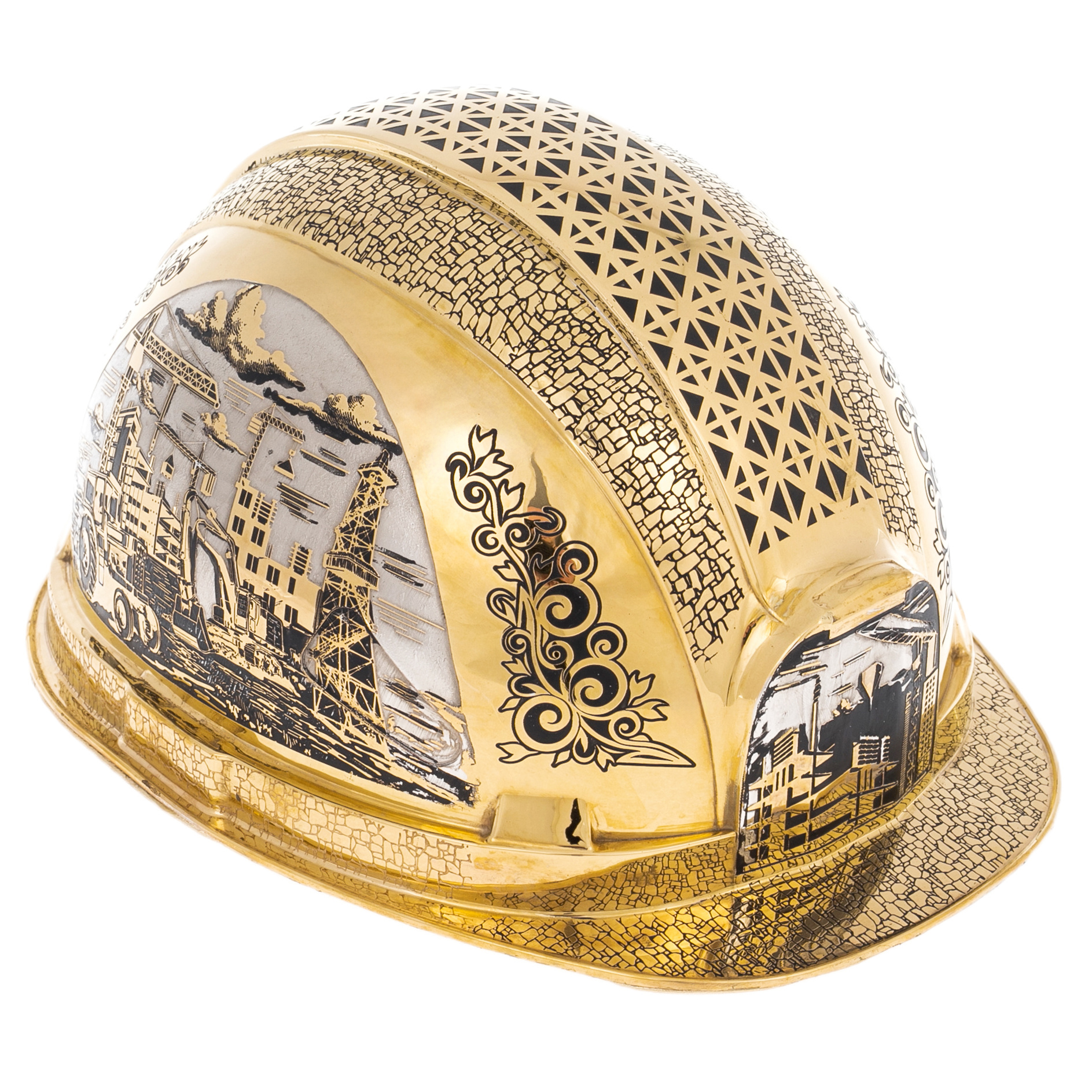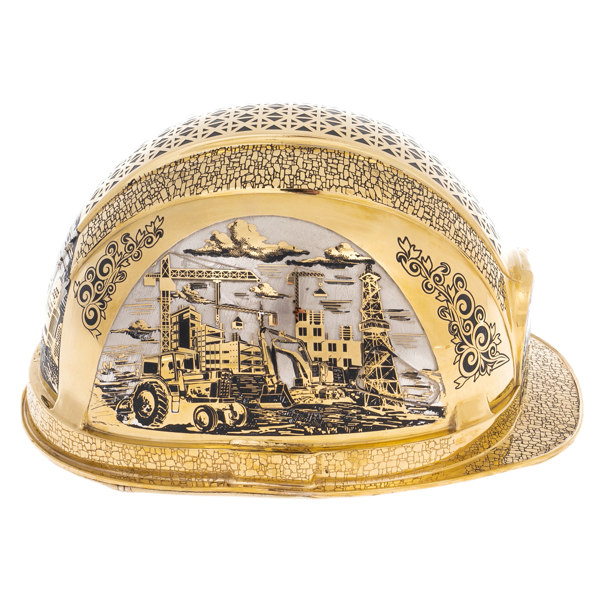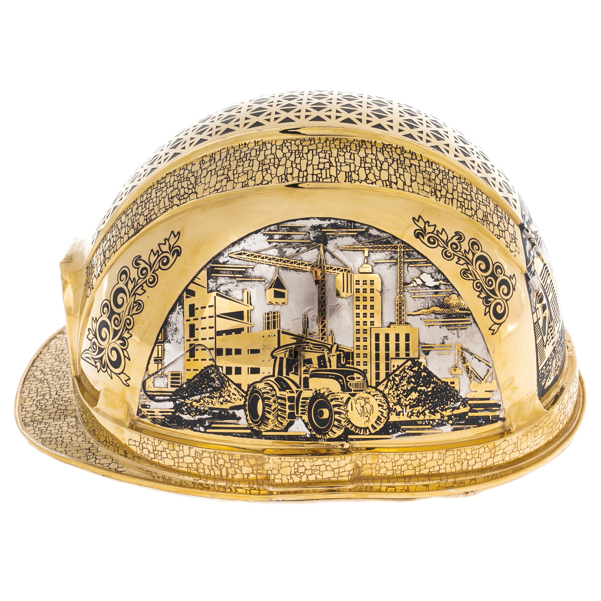 The gold—plated Stroika helmet from Zlatoust is an artistic metaphor for labor transformed into a symbol of power and creative energy. The product is made in the form of a construction helmet, but is embodied in premium materials: brass, plated with nickel and gold, the finest engraving, blackening and multi-layered pattern create a complex composition referring to the process of creation. The decorative panels carved on the domed surface are complemented by bas—relief subjects — construction machinery, cranes, silhouettes of new buildings, scenes of watch work - all this combines into a single narrative about a man building the future.