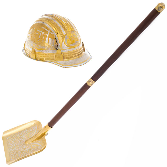 A set of souvenirs "Golden Money Shovel" and "Builder's Helmet" from Zlatoust are wonderful works of art that embody the sophistication, luxury and skill of Zlatoust engravers.
