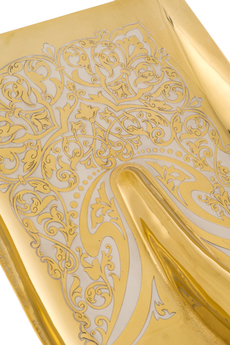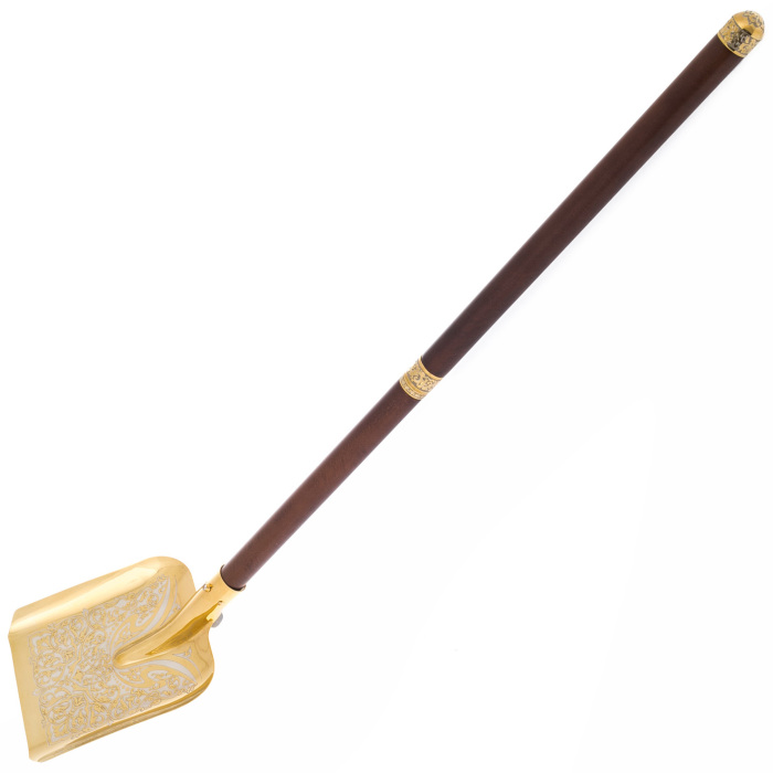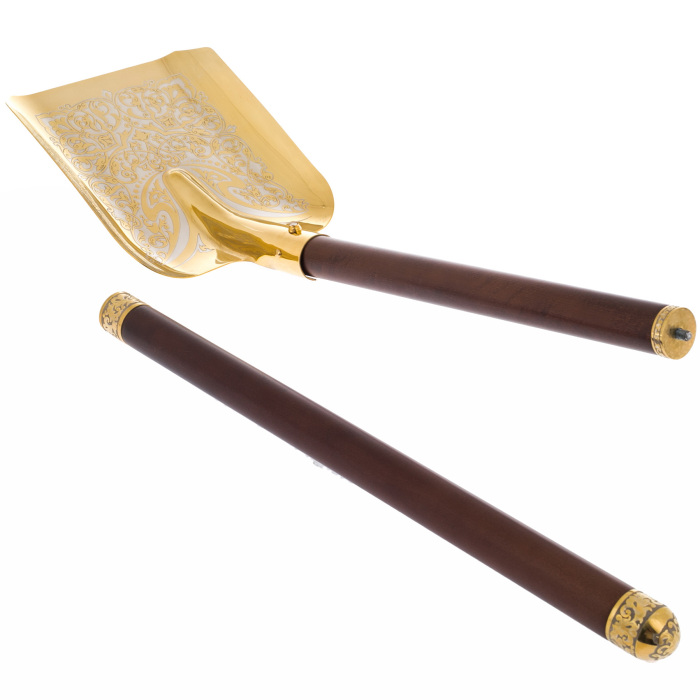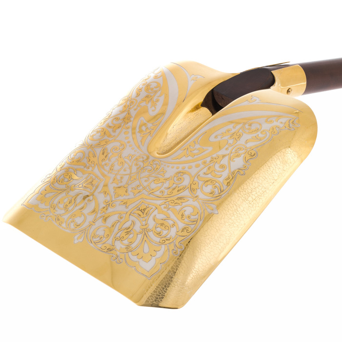 The gold money shovel is a unique souvenir made of high-quality metal and covered with gold, which gives it a dazzling shine and elegance. The shovel is decorated with intricate carvings in the traditional Zlatoust technique. The masters of Chrysostom, known for their unique skills in metal painting, created this product, combining elements of modern design and ancient traditions of Russian jewelry art. The shovel symbolizes wealth and prosperity, it can be used as an element of interior decoration, adding a touch of luxury and sophistication to it.
