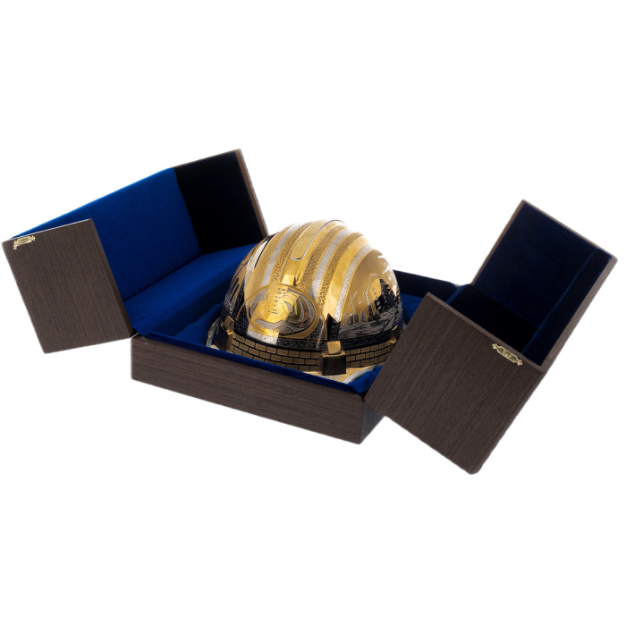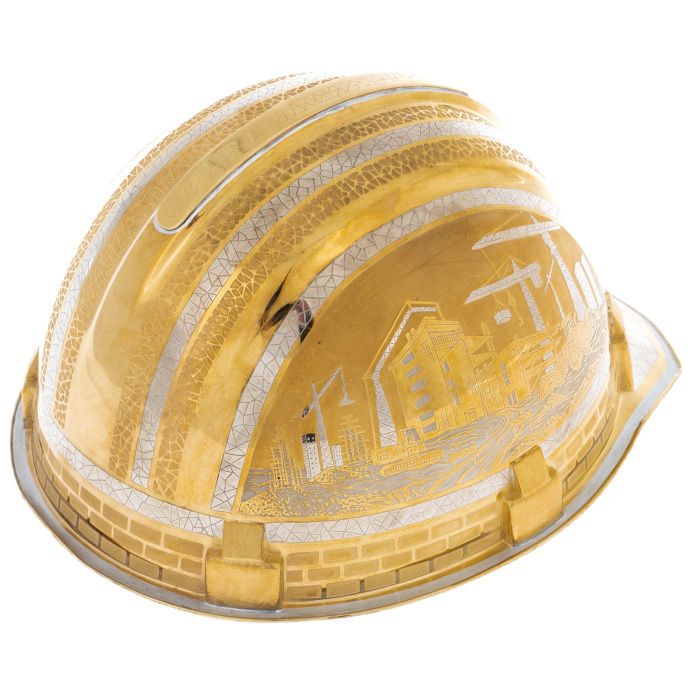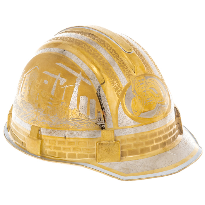 The helmet of the builder from Zlatoust is not just a protective headdress, but a real work of art. It is made of high-quality gold-plated metal and decorated with detailed engravings depicting construction cranes, buildings and other elements of the construction process. The inner part of the helmet is lined with soft leather, providing comfort when wearing. The helmet embodies construction craftsmanship and engineering, emphasizing the importance of labor and innovation in the construction industry.