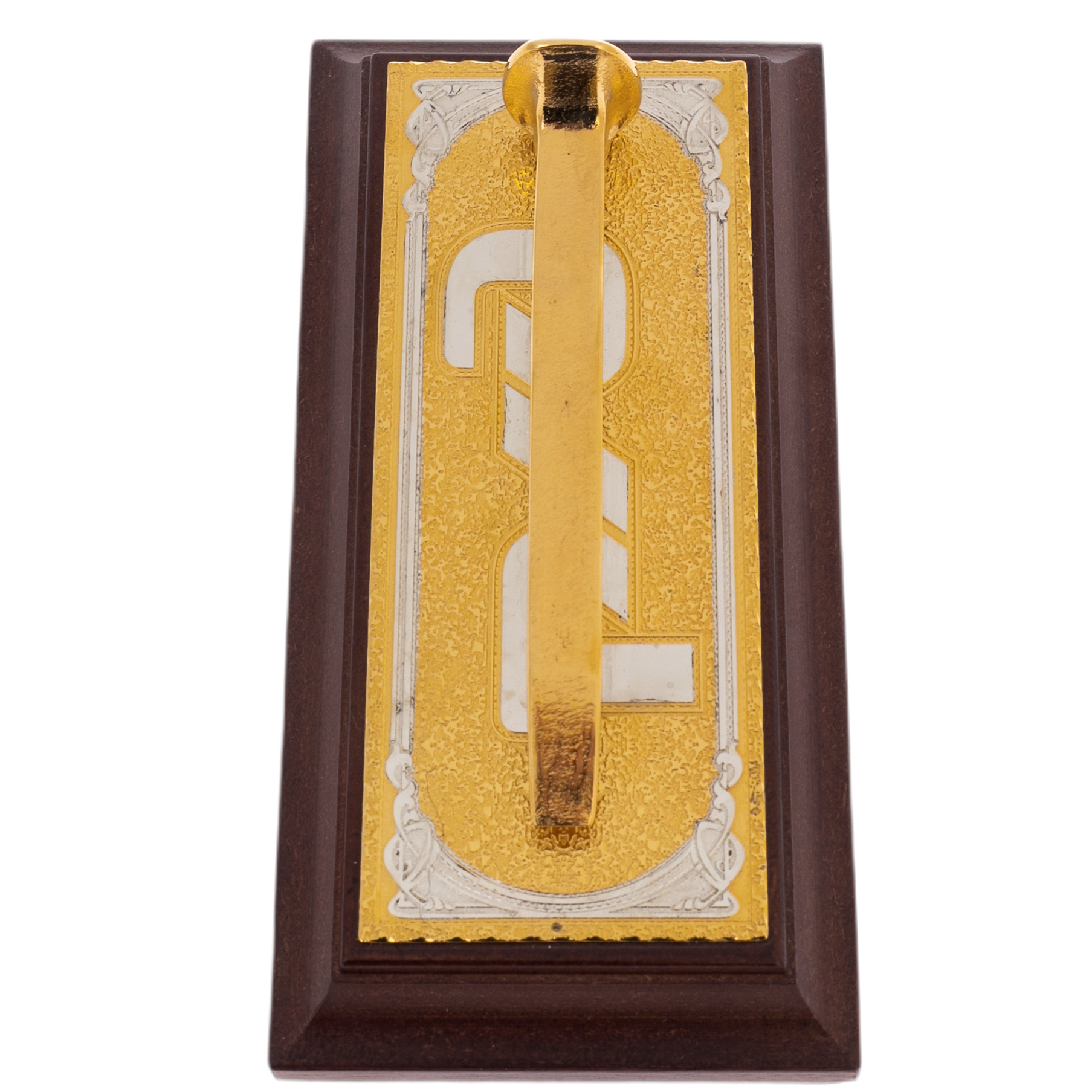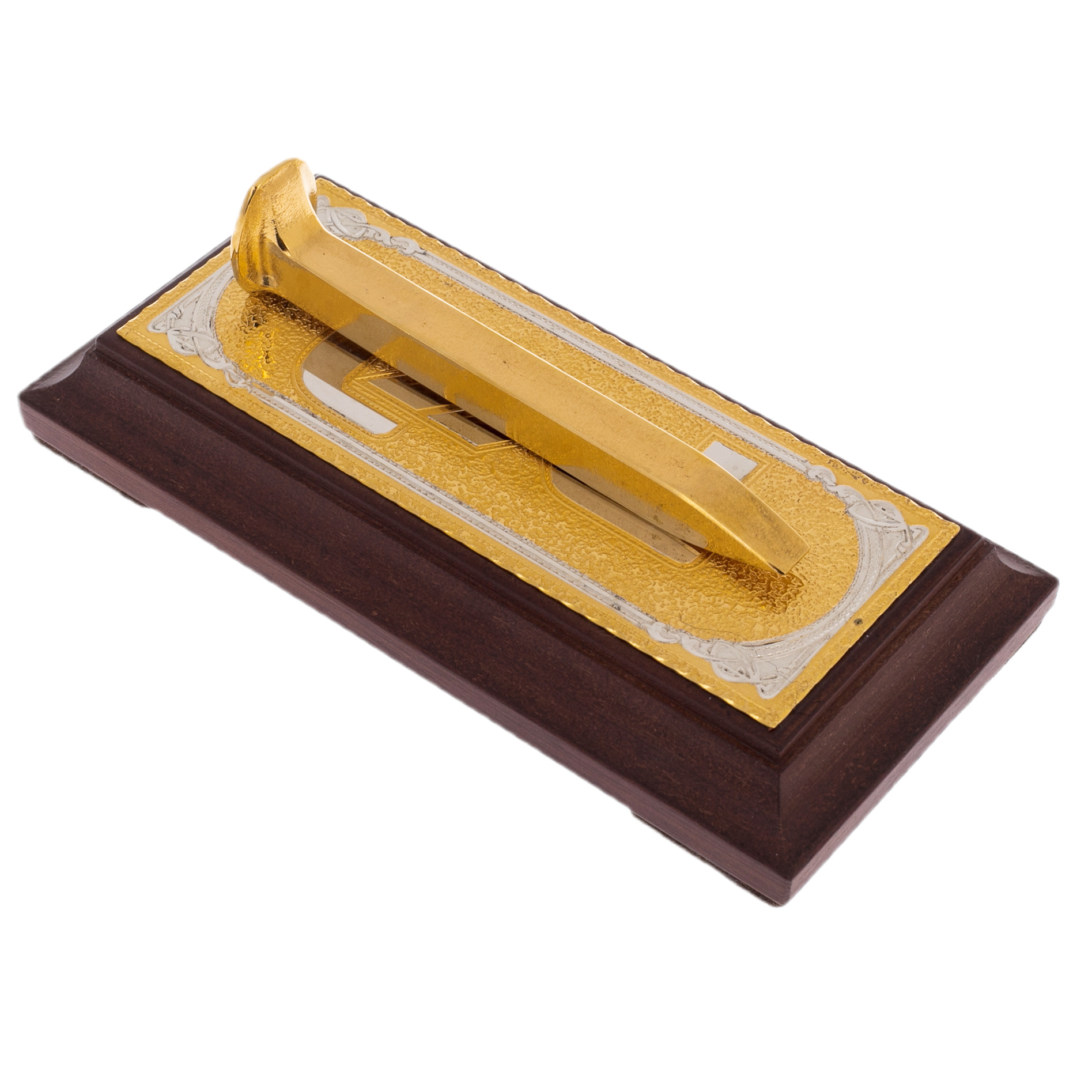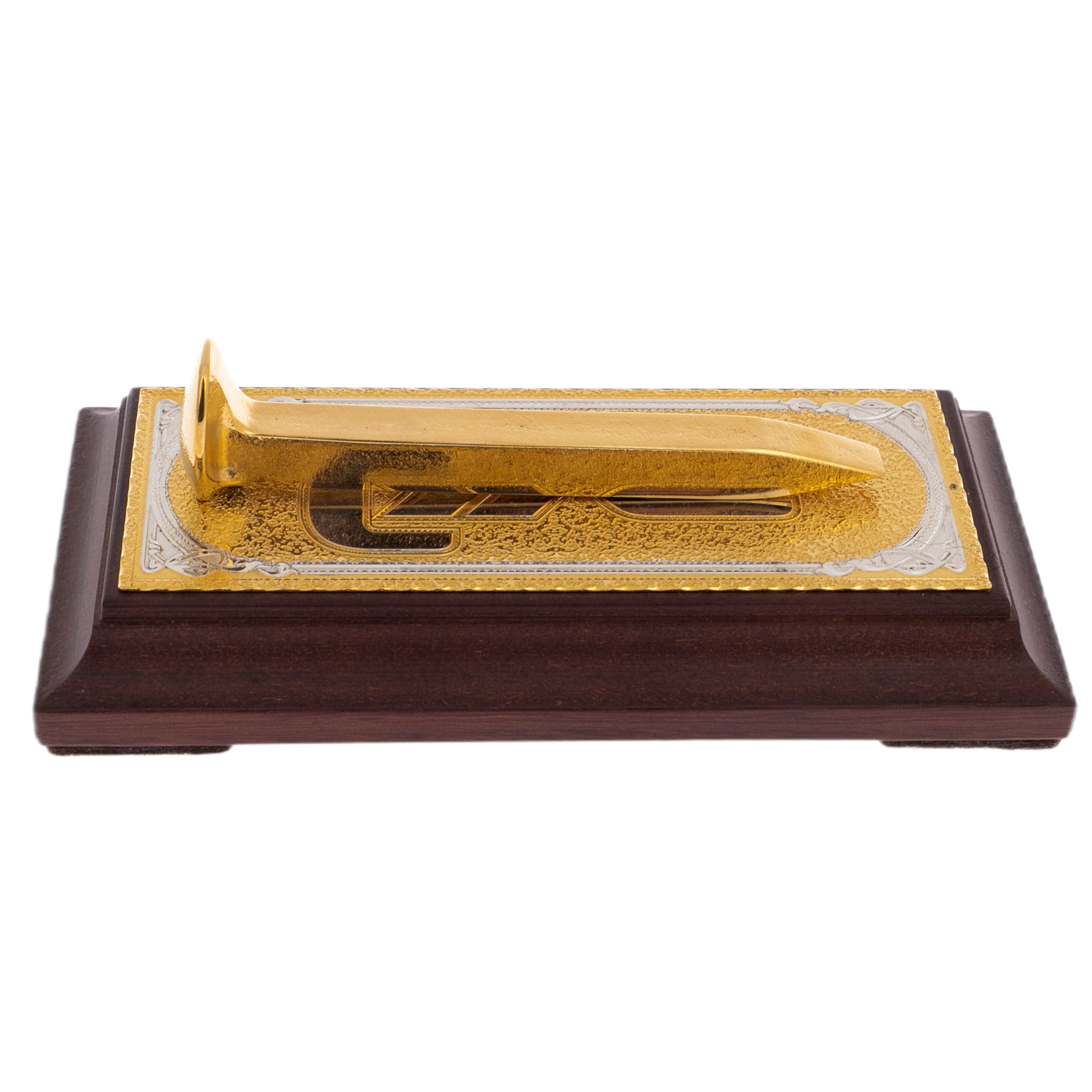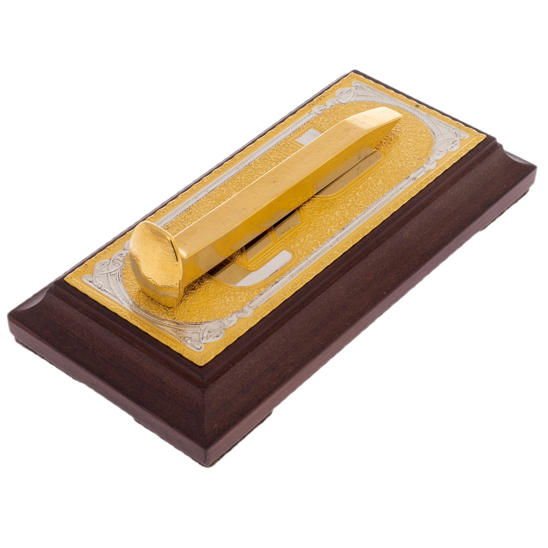 Основу композиции составляет металлическая пластина с гравированным узором, покрытой позолотой. Этот декоративный элемент смягчает суровый характер железнодорожного символа, превращая его в произведение ювелирного искусства. Теплый оттенок благородного металла, дополненный фактурой дерева, создает гармонию силы и утонченности, подчеркивая уникальность подарка.
