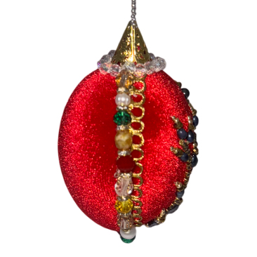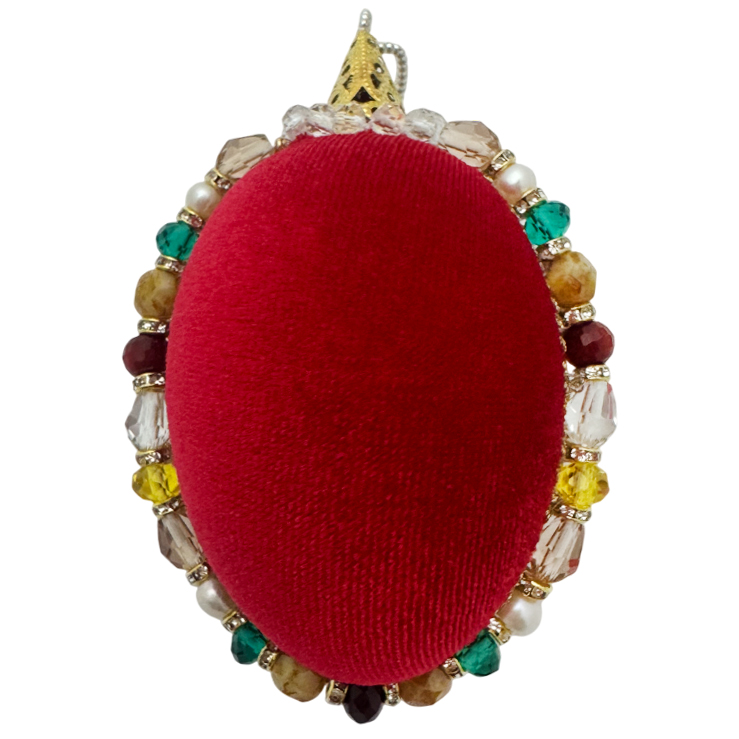 Вышитое яйцо "Пасха" — редкий пример ювелирного текстиля, объединившего в себе каноны православной традиции и блеск драгоценных ремёсел. Бархат насыщенного цвета, служащий фоном композиции, придаёт изделию глубину и торжественность, а орнамент, выполненный в технике ручного шитья и бисероплетения, воспроизводит ветви жизни — символы обновления, света и воскресения.
