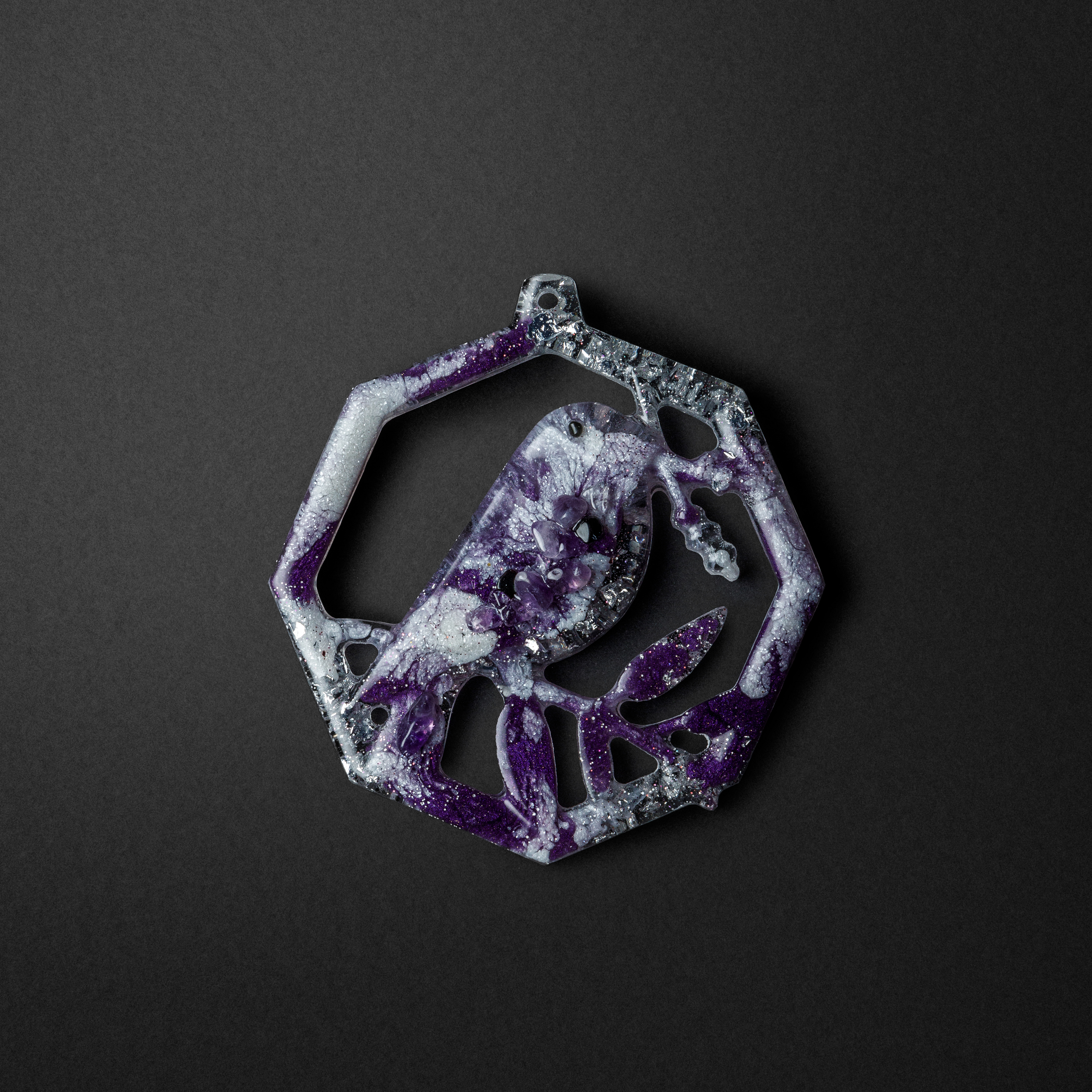Materials: amethyst, rhinestone, obsidian.
