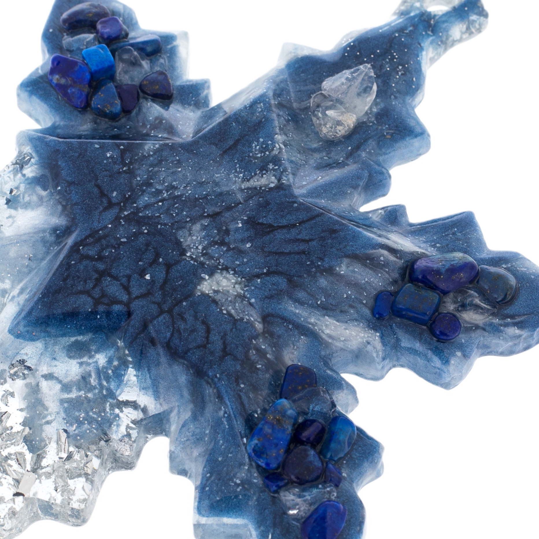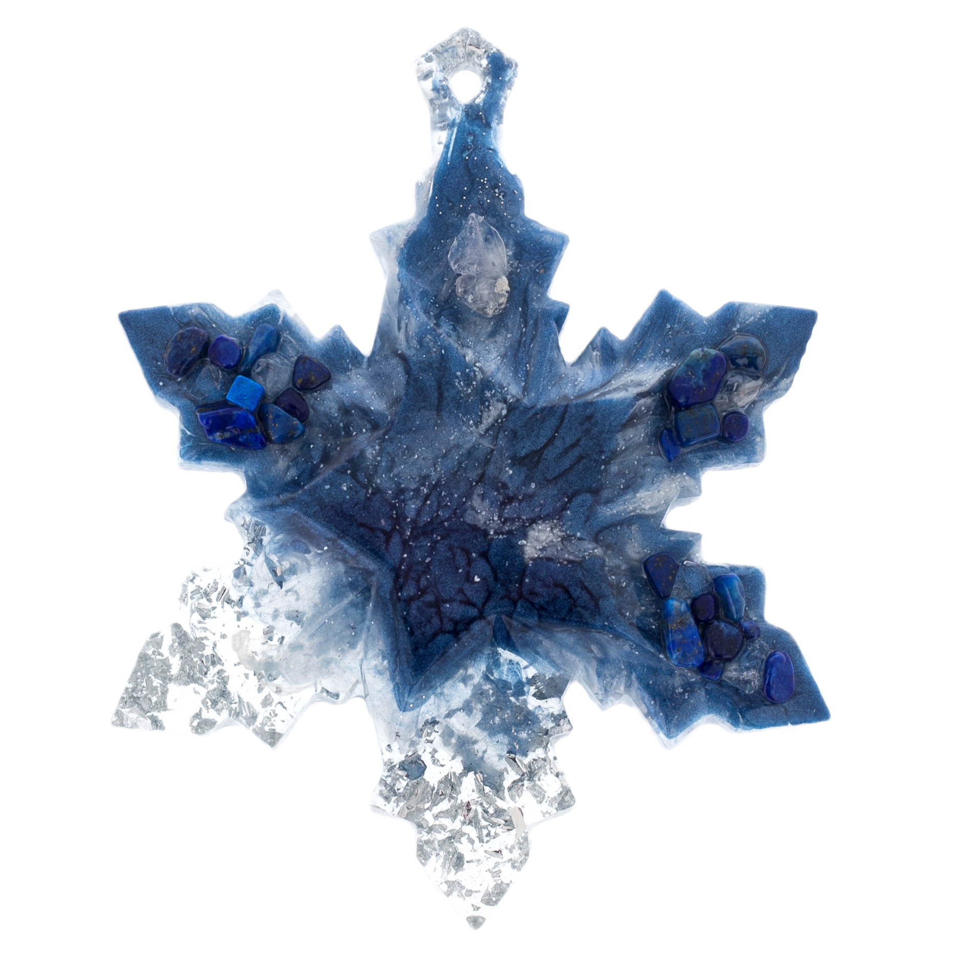 This Christmas tree toy made of resin jewelry is the epitome of a winter fairy tale, where the magic of the night sky is combined with the cold brilliance of winter. The star shines with a cold brilliance, like a frozen moment of winter dawn. Sodalite stones woven into icy patterns add to her special grandeur and power, making this toy a symbol of triumph and eternity.