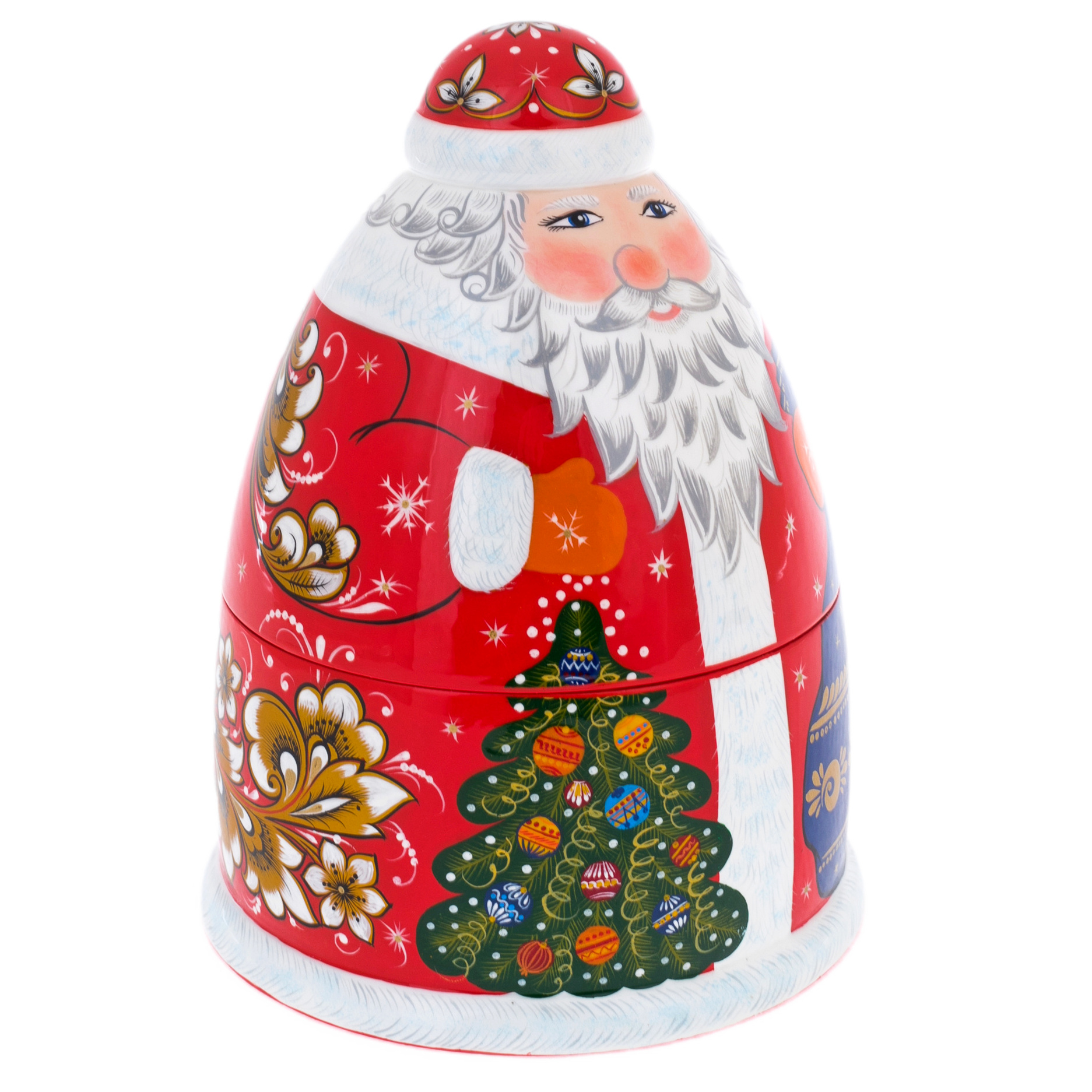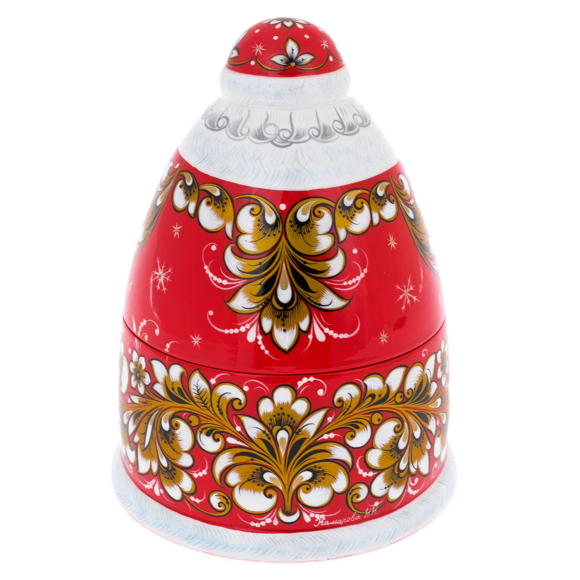 Each side of the case is decorated with festive ornaments combining gold and red shades, symbolizing wealth and abundance. The hand—painted work fascinates with its detail - every line and every curl of the ornament seems to tell its own fabulous story. The image is rounded off by a majestic hat topped with snow patterns and creating the illusion of a crown worthy of a true lord of winter.